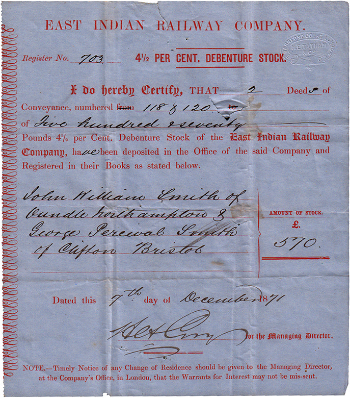 Registrato provvisoriamente a Londra il 14 maggio 1845 ma incorporato solo a Londra dall’Atto del Parlamento nel 1850, la rotta pianificata era da Calcutta seguendo il corso del Gange a Benares e Allahabad. La prima parte della linea fu aperta nel 1854 e la parte finale intorno a Benares fu aperta con grande festa nel dicembre 1862. Totale comprese le linee di brach 601 miglia. Capitale £ 4.000.000