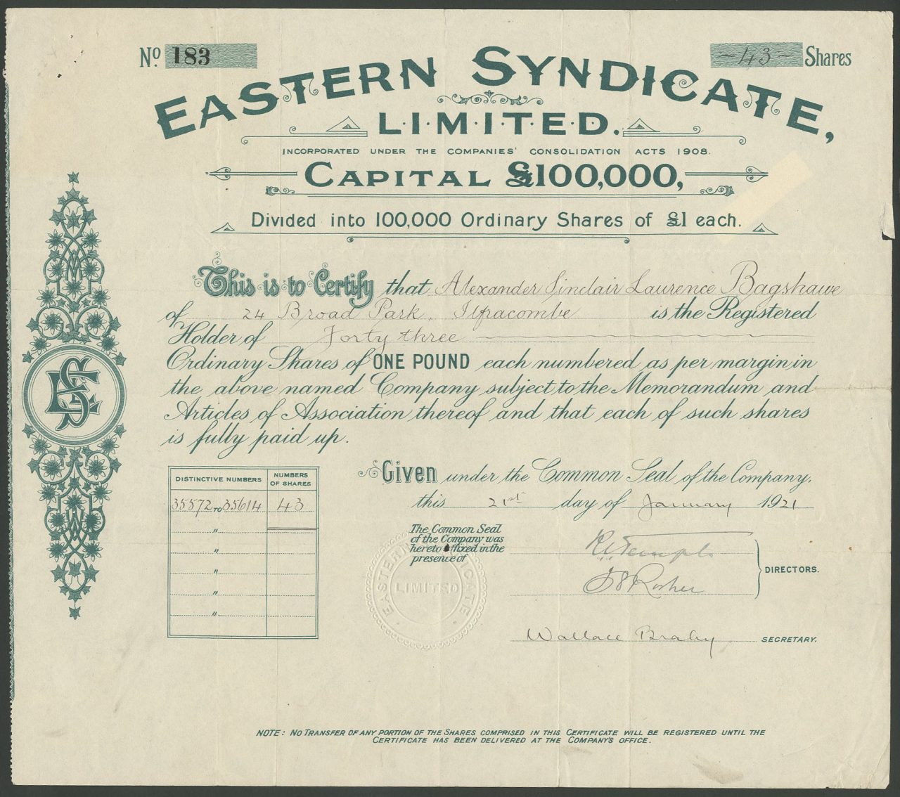 Registrato nel 1910 come Eastern Syndicate (1910) Ltd, il nome cambiò nel 1912. Dissolto <1916. Numero azienda 112159