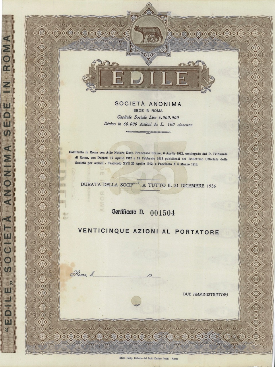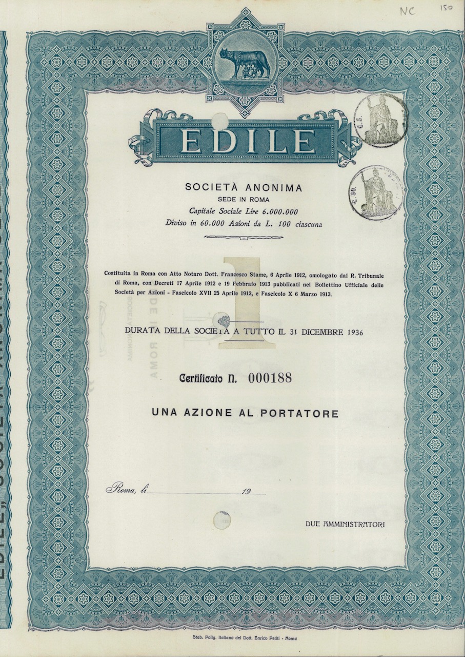 A-13157Edile Soc. An.-1Stab. Polig. Italiano del Dott. Enrico Petiti – RomaRoma19121 azioneR2 (1001-5000 pezzi)S1 (da 0 a 25 €)