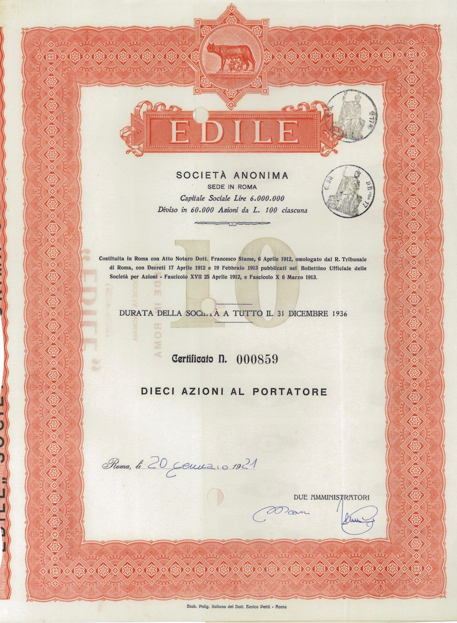 B-13157Edile Soc. An.-2Stab. Polig. Italiano del Dott. Enrico Petiti – RomaRoma192110 azioniR2 (1001-5000 pezzi)S1 (da 0 a 25 €)