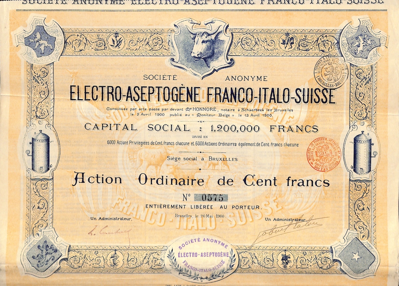 A-7617Electro-Aseptogène Franco-Italo-Suisse Soc. An.-1N.D.Bruxelles19001 azioneR3 (501-1000 pezzi)S2 (da 26 a 50 €)