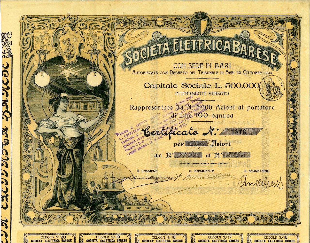Vera opera d'arte si certificato finanziario. Splendida grafica stile Liberty con elegante vignetta simbolicamente ispirata agli obiettivi sociali. La compagnia, autorizzata nel 1904, si occupò di dotare la città pugliese di energia elettrica nonché di costruire la linea tramviaria elettrica che, partendo da Piazza Sant’Antonio, collegava Bari a Carbonara e Ceglie. Timbro relativo alla riduzione del capitale sociale avvenuto nel 1921.
