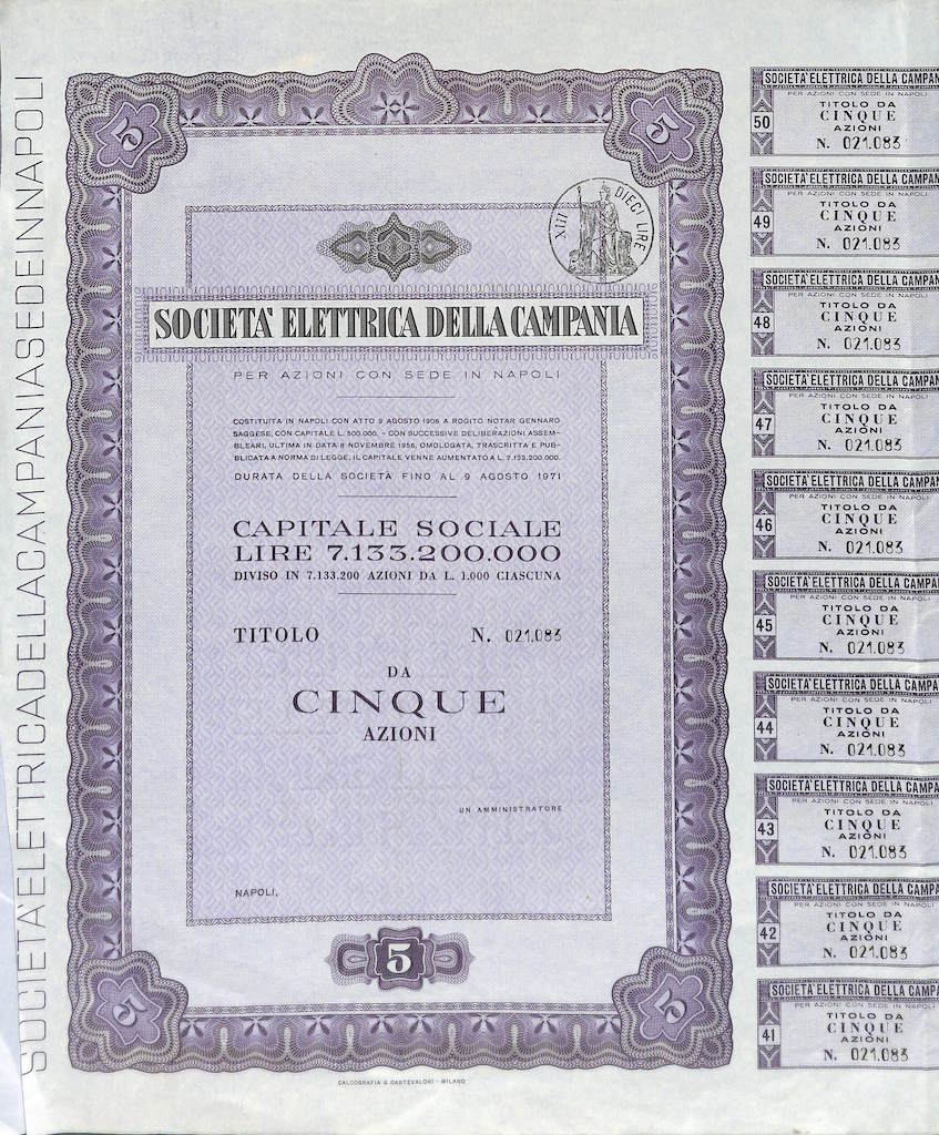 D-5726Elettrica della Campania Soc.-4Calcografia & Cartevalori - MilanoNapoli19575 azioni nominative da Lire 1.000R1 (Più di 5000 pezzi)S1 (da 0 a 25 €)