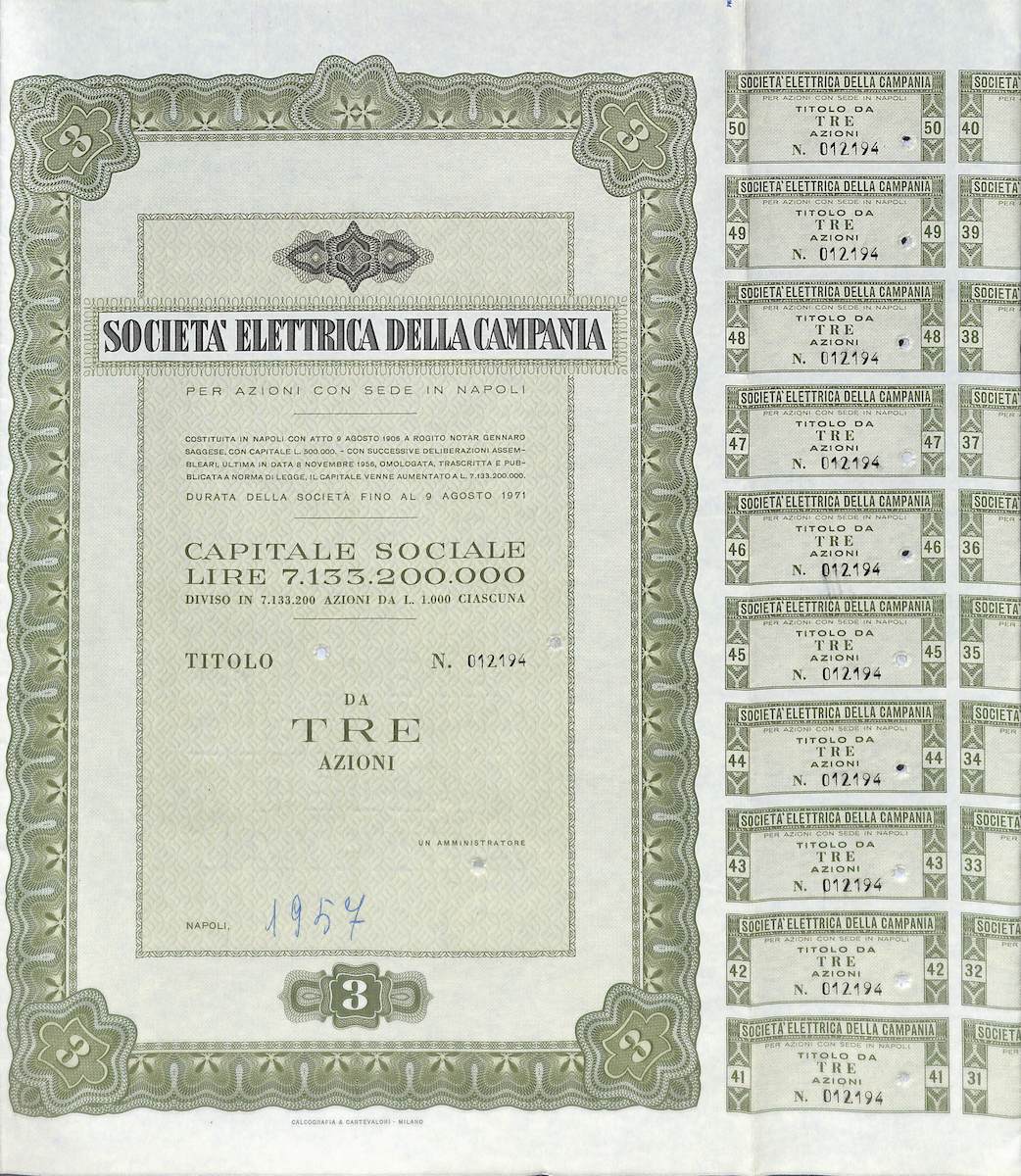 C-5726Elettrica della Campania Soc.-3Calcografia & Cartevalori - MilanoNapoli19573 azioni nominative da Lire 1.000R1 (Più di 5000 pezzi)S1 (da 0 a 25 €)