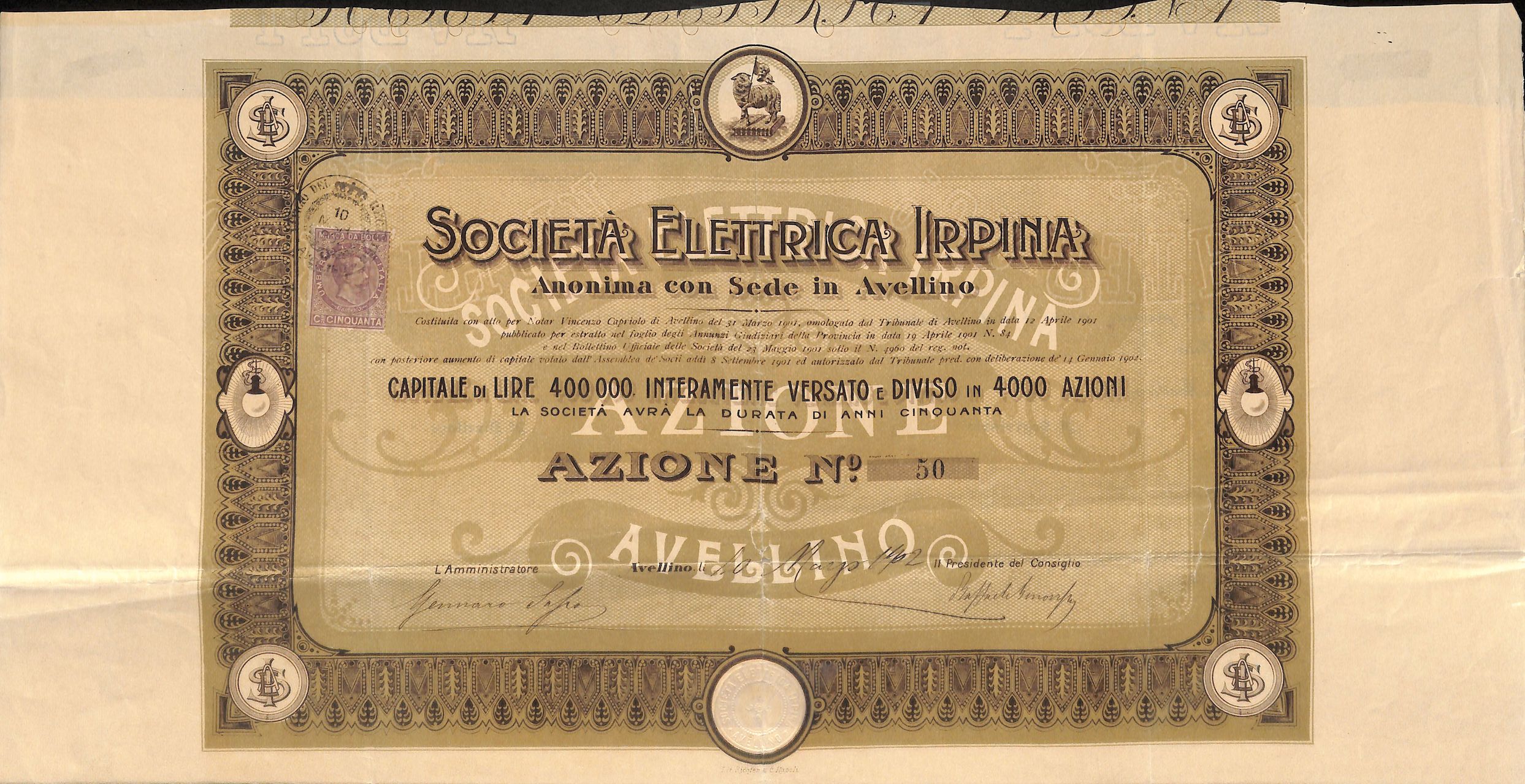 A-10639Elettrica Irpina Soc.-1Officina Carte Valori S.A. Richter & C. NapoliAvellino19021 azione da Lire 100R2 (1001-5000 pezzi)S3 (da 51 a 100 €)