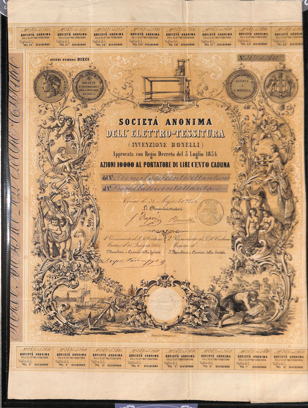 Un documento corredato da stupende allegorie simboleggianti gli obiettivi sociali. Oggi parliamo di un titolo al portatore di 10 azioni da 100 Lire Torino, emanato il 31 agosto 1854, dalla Società Anonima dell’Elettro – Tessitura (Invenzione Bonelli). Gaetano Bonelli, a capo dell’omonima società, crea la società per applicare nel settore tessile industriale la sua invenzione. Ovvero l’applicazione dell’elettricità come forza regolatrice ai famosi telai Jacquard mediante l’impiego di una guida elettro-magnetica e la sostituzione della messa in cartoni con l’armatura in licci, nell’intento di semplificarne il meccanismo. L’energia elettrica viene così fornita da batterie poiché l’elettricità via cavo non è ancora disponibile. Una scoperta che viene accolta con clamore dal mondo tessile industriale che, già all’inizio dell’Ottocento, grazie all’introduzione delle prime macchine tessili e in particolare dei filatoi automatici, detti mule, a opera di Pietro Sella (1784-1827), subisce una repentina trasformazione. L’affermarsi delle nuove tecnologie e delle prime fabbriche tessili, porta la progressiva suddivisione e specializzazione del lavoro, determinando da un canto la formazione di nuovi profili professionali all’interno del sistema di fabbrica e rafforzando dall’altro il ceto dei tessitori a domicilio. Nei decenni successivi, alle storiche dinastie tessili di origine manifatturiera, si affiancano imprenditori di origine operaia che danno nuovo slancio alla produzione. A metà Ottocento si registra così un netto incremento produttivo.
