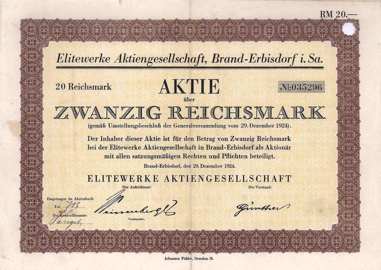 E' nata da una società fondata a Berlino nel 1904 da Emile Luders Masch.-Fabrik für die Automobilbau, alla quale Georg Günther si unì nel 1913, fondatore del Presto-Werke di Chemnitz. La prima automobile, un 10/38 CV a quattro cilindri, fu costruita un anno dopo. Nel 1915 Günther divenne direttore generale dell'azienda, che fu ribattezzata Elitewerke AG e dopo la prima guerra mondiale con la partecipazione del produttore di motociclette J.S. Rasmussen (DKW) ha iniziato una produzione automobilistica. Brand-Erbisdorf produceva automobili, motociclette e macchine per passeggeri e camion. Il modello di punta nella costruzione di automobili dal 1920 era una lussuosa auto da turismo con una macchina a 6 cilindri da 4600 cc. Lo stabilimento di Siegmar produceva bi... Altro