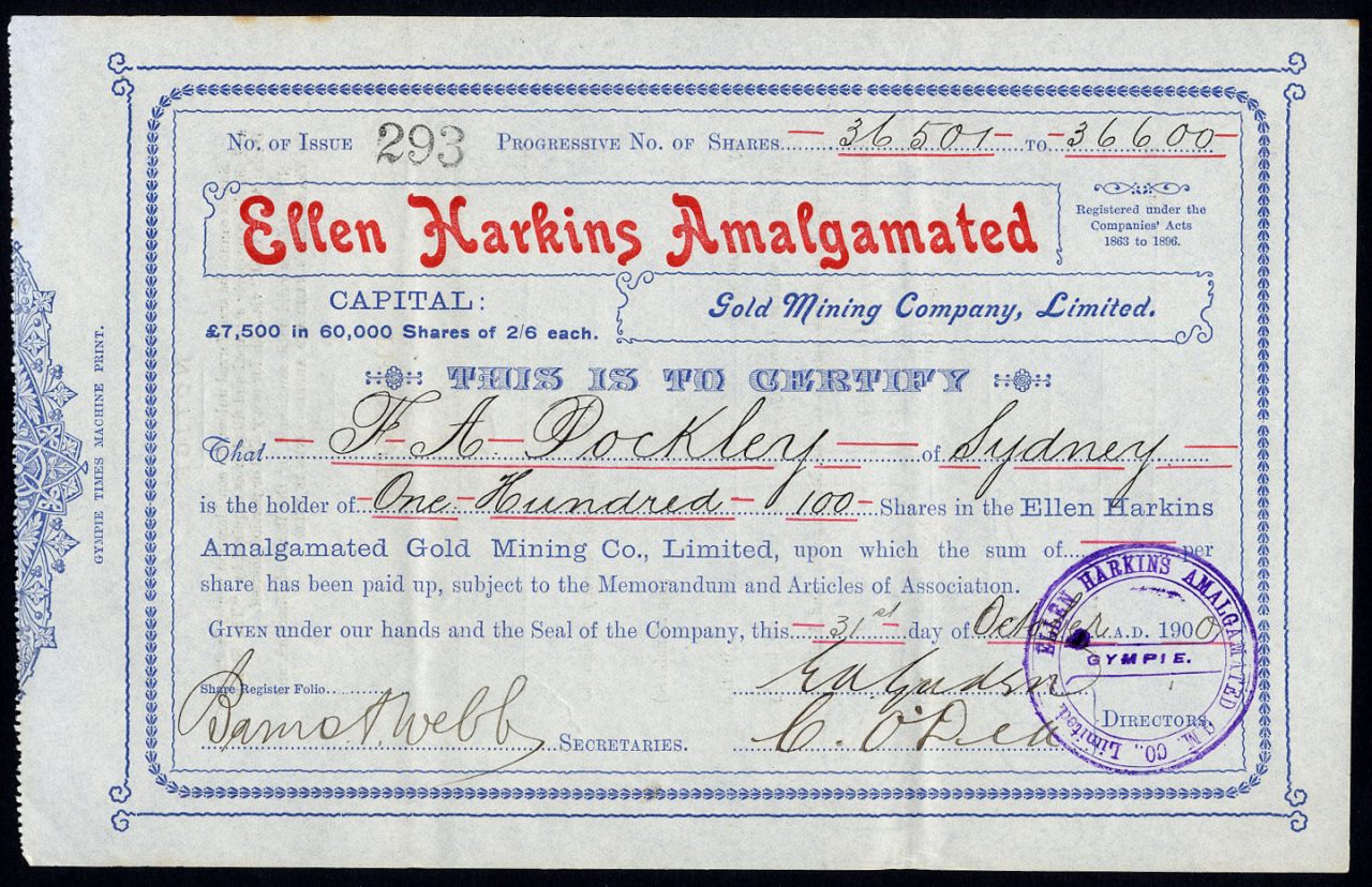 A-32088Ellen Harkins Amalgamated Gold Mining Company Limited-1Queensland1900sharesR2 (1001-5000 pezzi)S2 (da 26 a 50 €)