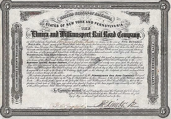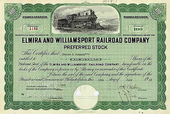 Con la sua concessione del 9 giugno 1832, la Williamsport & Elmira RR era una delle più antiche ferrovie degli Stati Uniti. Il tratto di 75 miglia di Williamsport, Pa. dopo Elmira, N.Y. fu completato nel 1854. Riorganizzato come Elmira & Williamsport RR nel 1860. Nel 1863 si unì al Northern Central Ry, parte del sistema RR della Pennsylvania che ha continuato la ferrovia come Divisione Elmira. Nel 1972 venne distrutto e allagato dall’uragano Agnes.