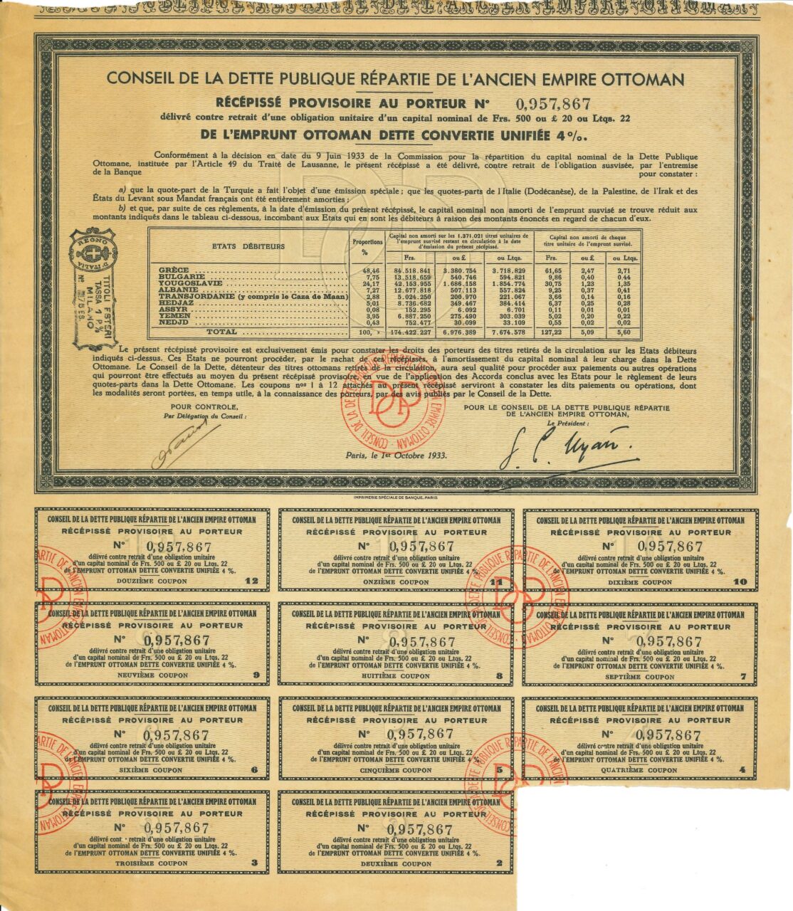 A seguito del crollo dell’Impero Ottomano dopo la Prima Guerra Mondiale, i trattati di pace imposero una ripartizione dei debiti dell’ex Impero tra i nuovi Stati che ne ereditarono le responsabilità territoriali. Il Trattato di Losanna (1923) stabilì le modalità di pagamento per le annuità arretrate della Dette Publique Ottomana. Gli Stati successori, tra cui la Turchia, la Grecia e la Bulgaria, furono incaricati di pagare le somme dovute, come dettagliato nel certificato. Questo processo era gestito dal Consiglio della Dette Publique Répartie, istituito appositamente per amministrare la gestione del debito.