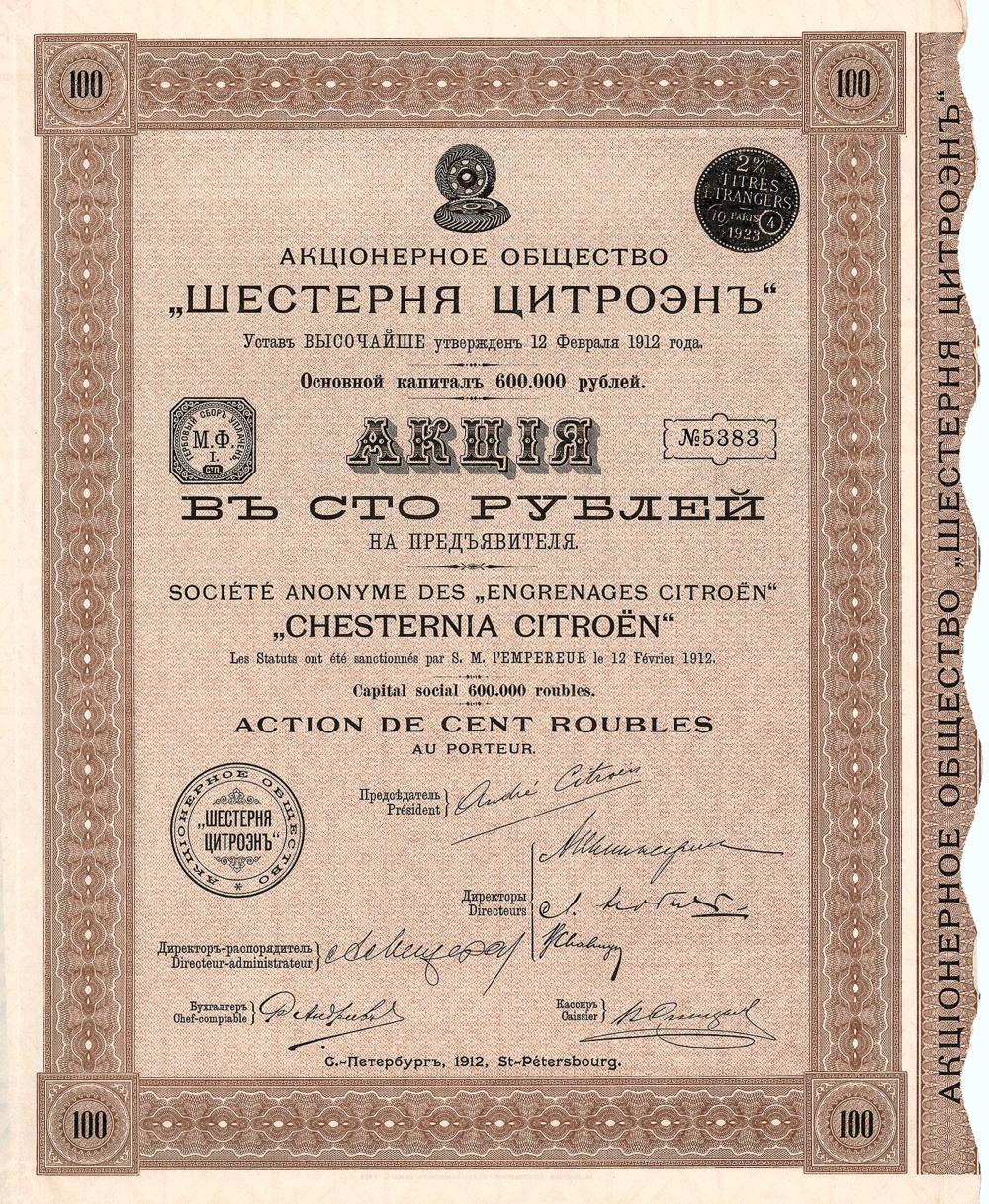 A-62768Engrenages Citroën “Chersternia Citroën” S.A. des-1San Pietroburgo19121 azione da 100 RubliR3 (501-1000 pezzi)S3 (da 51 a 100 €)