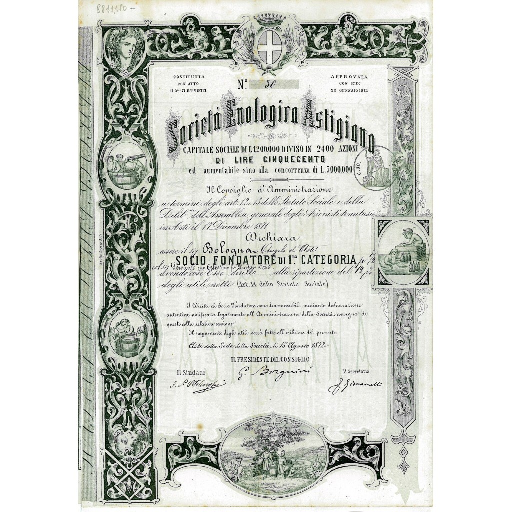 La società fu costituita nel 1872 da alcuni imprenditori locali - fra cui Angelo Bologna intestatario del certificato - per ovviare ai problemi di sovrapproduzione vinicola, offrendo valide soluzioni al mercato enologico. Il grandioso complesso, progettato dall’architetto Rocco Porzio, si estendeva su un’area di 35.000 metri quadrati a pochi metri dalla ferrovia e comprendeva magazzini, laboratori, uffici e abitazioni: l’azienda poteva pertanto usufruire di un binario privato per il trasporto di vini, vermouth e champagne prodotti. Dopo quattro anni la società si trasformò in Unione Enofila d’Asti, fallita nel 1888. Lo storico palazzo dell’Enofila, acquistato dal Comune, fu affittato dal 1906 al 1989 alla Vetreria Operaia Federale, è ora adibito a manifestaz... Altro
