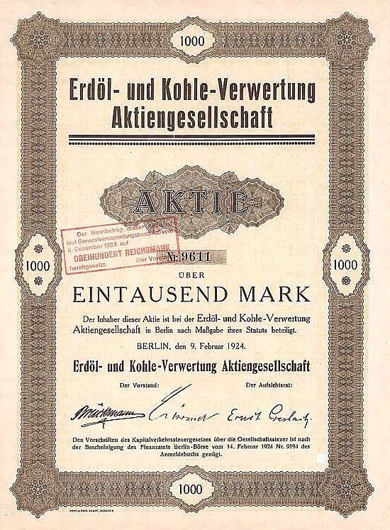 Fondata nel 1914 come azienda di riciclaggio di oli minerali. Nel 1916 trasferimento da Dresda a Berlino. L’azienda era originariamente una società di ricerca il cui compito era quello di testare e addestrare i processi per l’estrazione di idrocarburi leggeri da quelli pesanti. In quest’area hanno incontrato il lavoro del Dr. Bergius, che serviva agli stessi scopi (processo Bergin). Un’unione di interessi ha portato alla formazione del Consortium for Coal Chemistry, che ha messo a disposizione un capitale di 30 milioni di RM per la ricerca dei processi e della tecnologia ad alta pressione associata e per lo svolgimento del lavoro e dello sfruttamento di Erdöl- und Kohlen-Verwertung AG (Evag). Nel 1926 acquisizione da parte di I.G. Farbenindustrie AG.