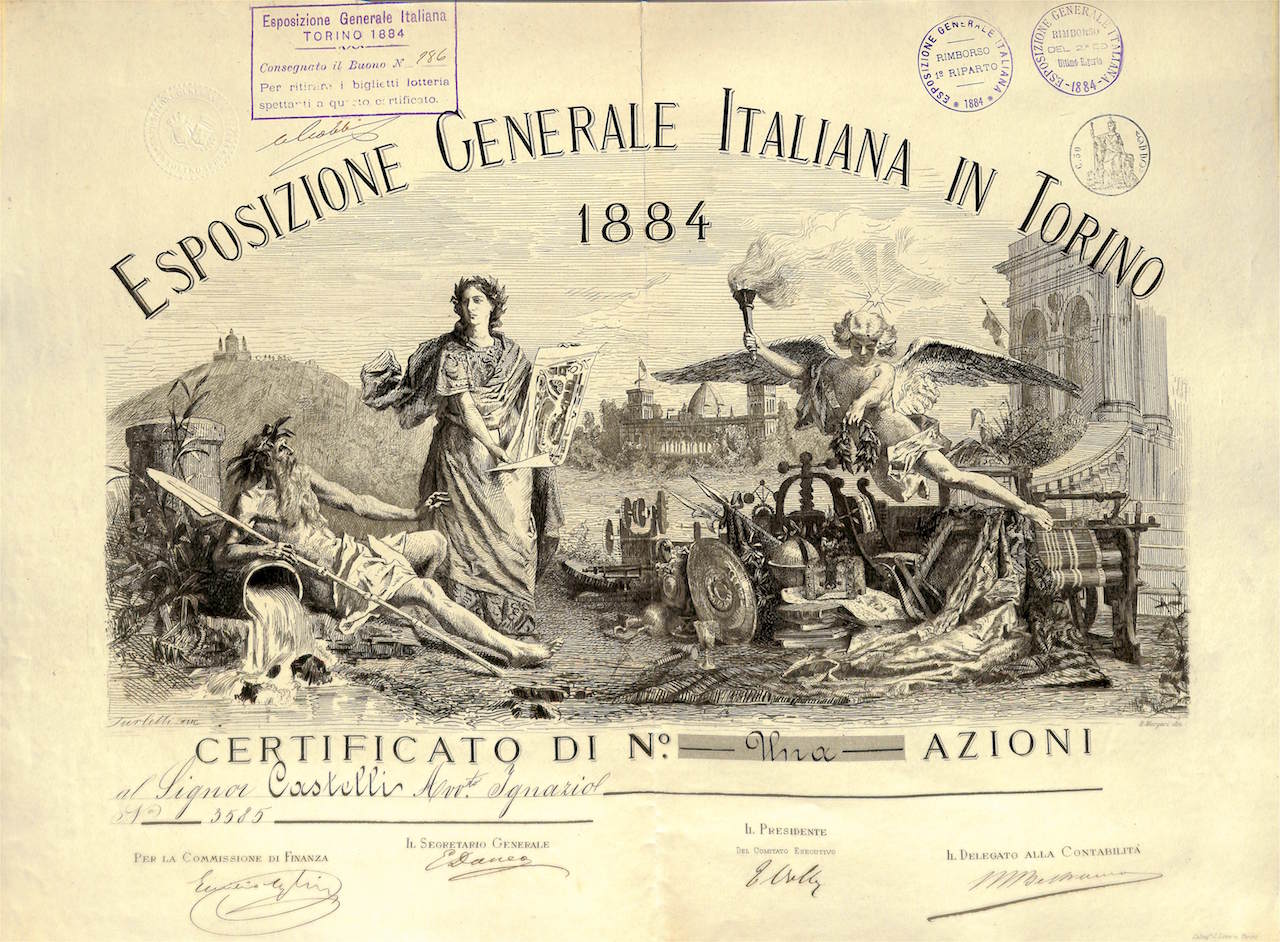 Si tratta di un’azione emanata per finanziare l’Esposizione Generale Italiana del capoluogo piemontese del 1884. I fondi necessari per l’esposizione vengono raccolti, oltre che con contributi del governo, del municipio di Torino e della provincia, mediante sottoscrizione di azioni da Lire 100 rimborsabili al termine della manifestazione qualora il bilancio risultasse in attivo, nonché con oblazioni a fondo perduto, senza alcun limite di importo. Coloro che sottoscrivono le azioni e le oblazioni possono entrare gratuitamente all’esposizione (le sottoscrizioni a livello nazionale raggiungono la cospicua somma di 1.700.000 Lire). Quella del 1884 è la prima delle due esposizioni che si tengono negli ultimi due decenni dell’800 a Torino, la seconda si svolge nel 1898. L’esposizione del 1884, organizzata dalla “Società promotrice dell’industria nazionale”, viene articolata in otto categorie: Belle arti, Produzioni scientifiche e letterarie, Didattica, Previdenza e assistenza pubblica, Industrie estrattive e chimiche, Industrie meccaniche, Industrie manifatturiere, Agricoltura e materie alimentari.