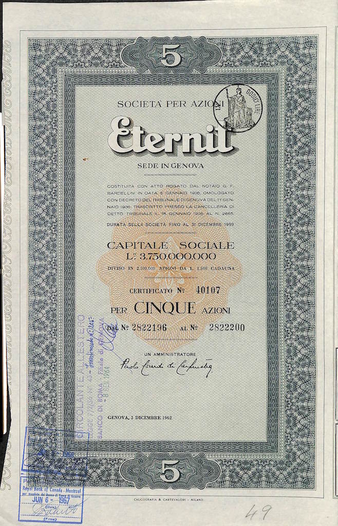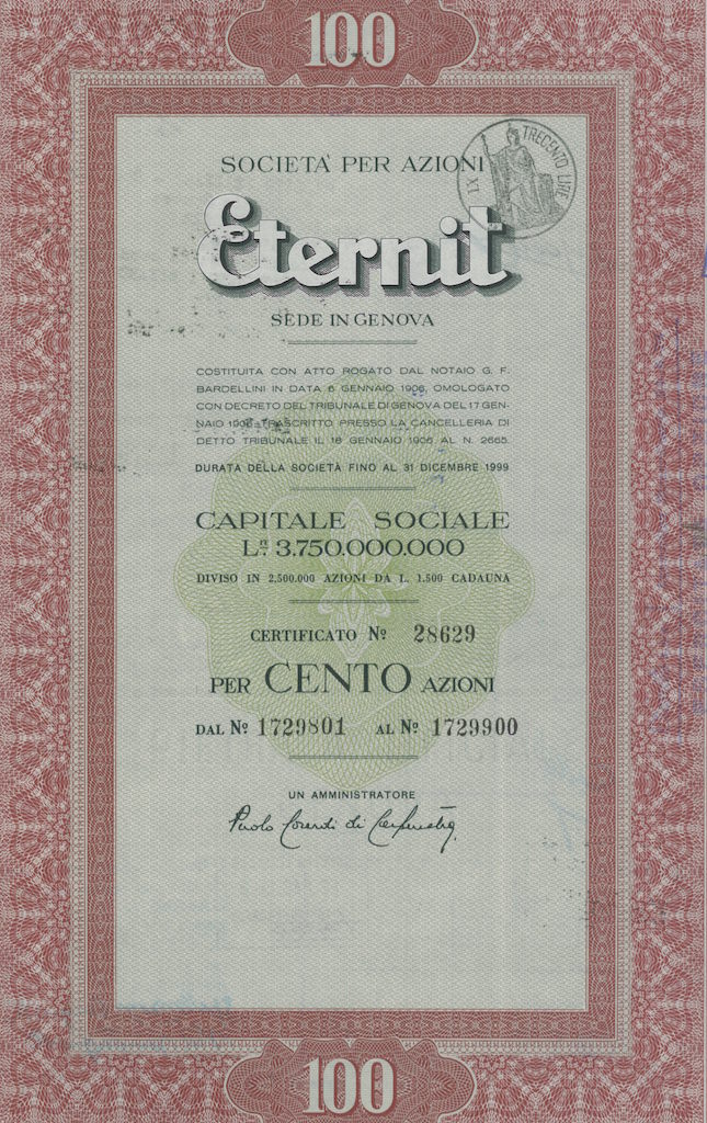 Nel 2009, in seguito alle indagini condotte da Raffaele Guariniello presso il Tribunale di Torino, inizia il processo contro Stephan Schmidheiny,[8] ex presidente del consiglio di amministrazione, e contro Louis De Cartier de Marchienne, direttore dell’azienda negli anni sessanta (De Cartier è morto nel 2013 a 92 anni). Essi sono ritenuti responsabili delle morti per mesotelioma avvenute tra i dipendenti delle fabbriche Eternit a contatto con l’asbesto.