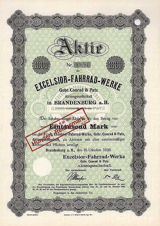 A-66636Excelsior-Fahrrad-Werke Gebr. Conrad & Patz-1Brandenburg19231 azione da 1.000 Marchi--