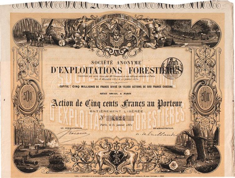 Lo scopo della società era lo sfruttamento delle zone boschive, come si evince anche dalle suggestive immagini che arricchiscono l’elaborata cornice del titolo: il taglio degli alberi, la prima lavorazione dei tronchi e il loro trasporto a fini commerciali. Operava soprattutto nella foresta di Rozzo Alto, nel Comune di Vieste in Puglia.