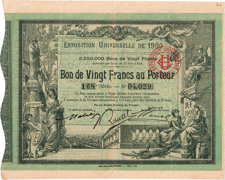 Esposizione Univerale di Parigi, la prima del Novecento, che rispecchia una Francia repubblicana, economicamente fiorente e che guarda con ottimismo al nuovo secolo. Superba veste grafica ricca di personificazioni simboliche.