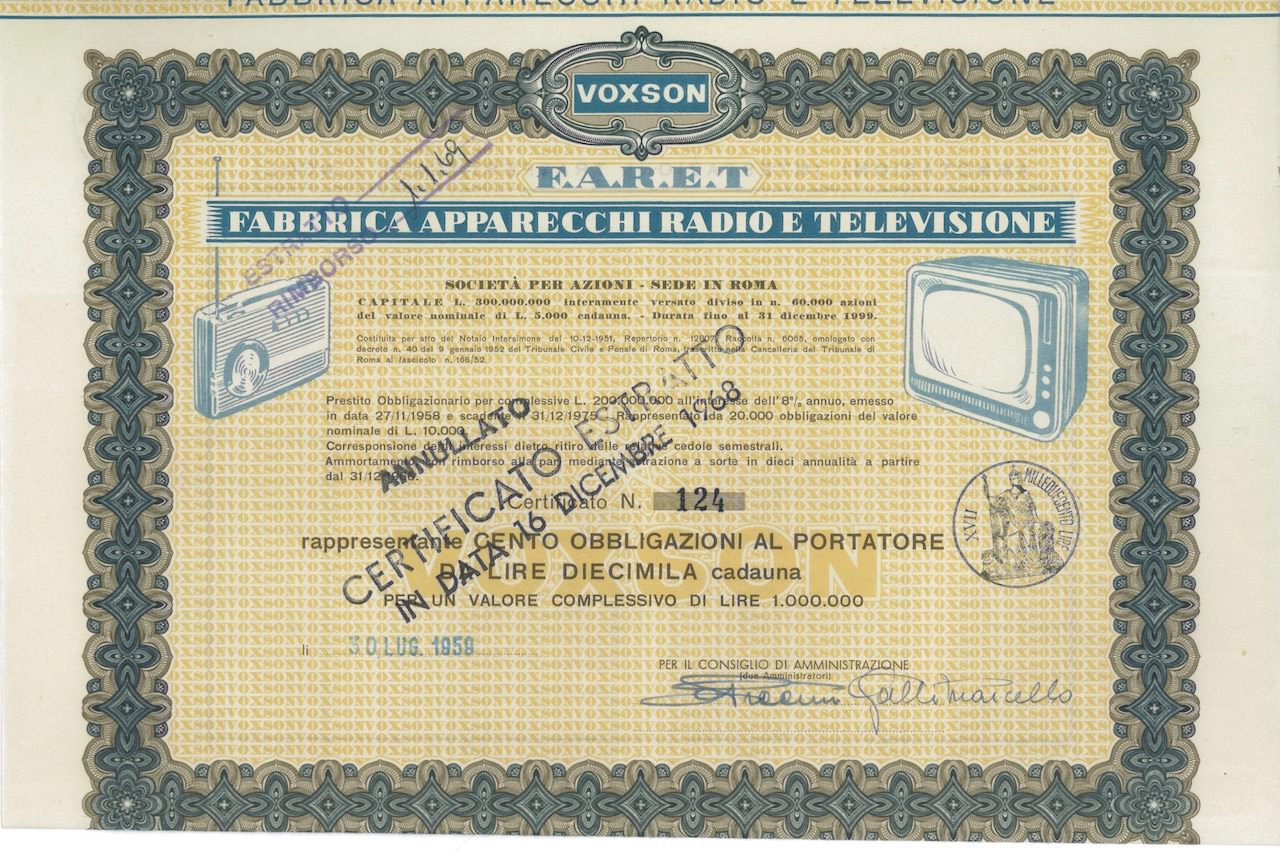 C-13543F.A.R.E.T. – Fabbrica Apparecchi Radio e Televisione Voxson-3Stab. L. Salomone - RomaRoma1959100 obbligazioni (cap. soc. L. 300.000.000)R2 (1001-5000 pezzi)S1 (da 0 a 25 €)