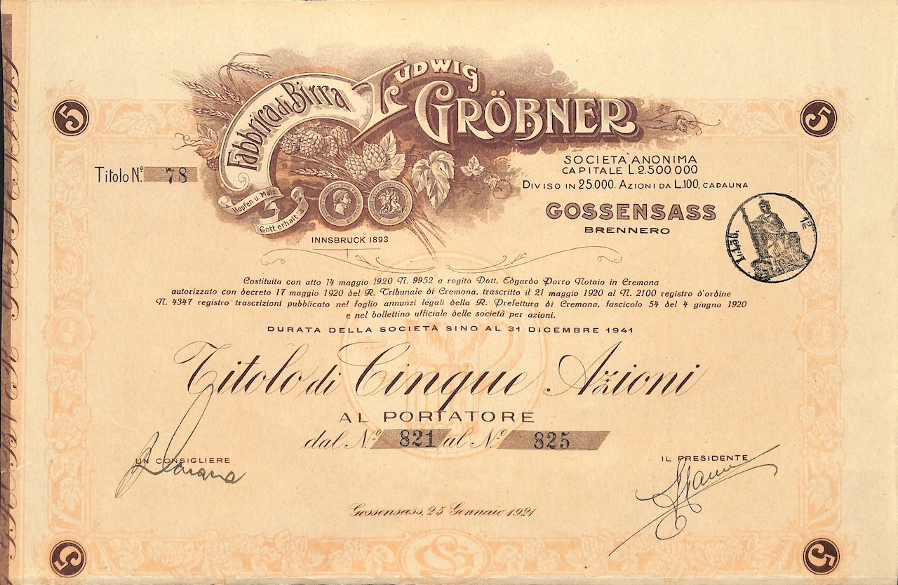 Birreria Goessensass iniziò la sua attività nel 1878 e chiuse i battenti nel 1980 a Vipiteno. Emesso a Gossensass ovvero Colle Isarco, una frazione del Comune di Brennero in provincia di Bolzano, il 25 gennaio 1921. Spighe di grano e coni di luppolo. Dallo sfondo emerge un medaglione che racchiude un boccale ricolmo di birra spumosa.