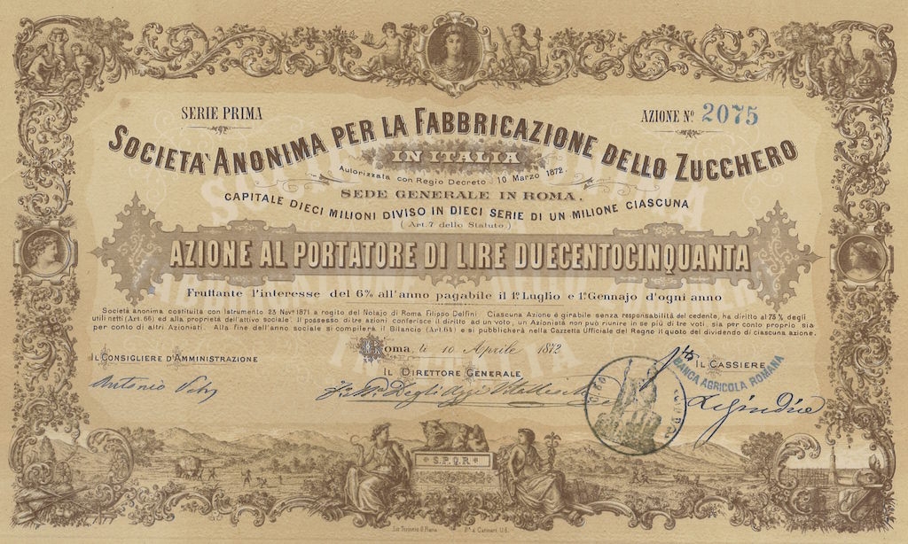 Bellissimo documento impreziosito da fregi e personificazioni allegoriche. Coupons lungo il margine inferiore e quelli laterali. La fabbrica sorse alla periferia della città di Rieti, al confine tra la città stessa e la piana Reatina. Produsse zucchero e vari distillati fino al 1944, anno in cui a causa dei danni riportati in seguito ai bombardamenti della II guerra mondiale, l’attività dell’azienda fu interrotta.