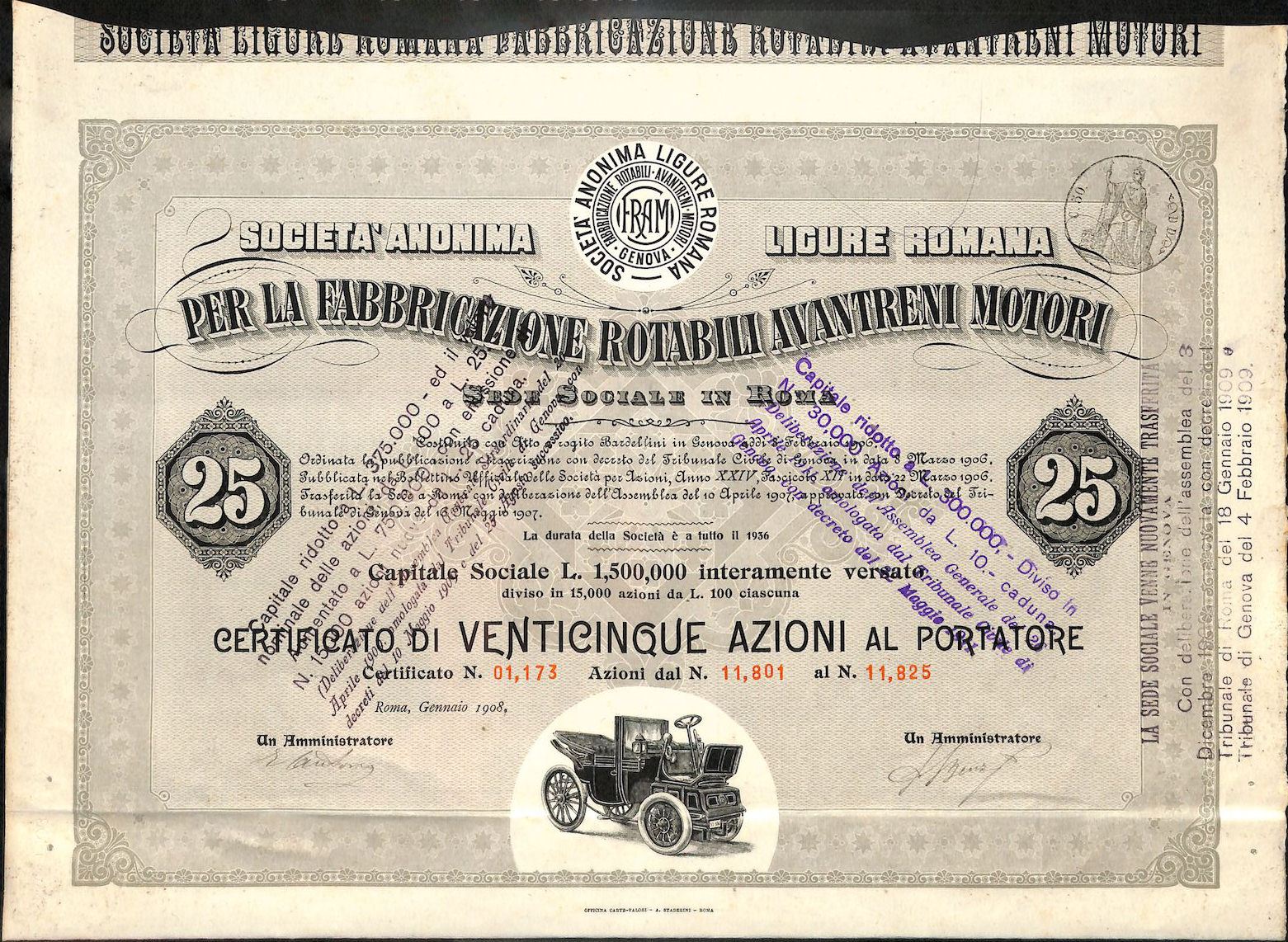 La sede restò a Roma fino al 1906 quando l’azienda cambierà nuovamente denominazione in SALR (Societa Anonima Ligure Romana), spostando la sede a Genova ma conservando la produzione nella capitale; restò attiva poi fino al 1914 con l’inizio della prima guerra mondiale.