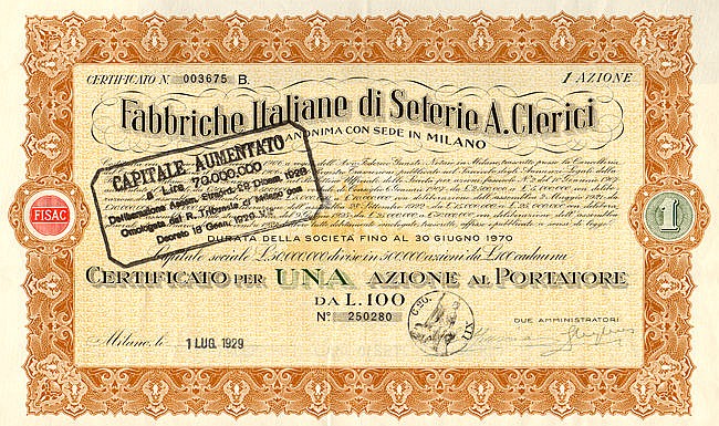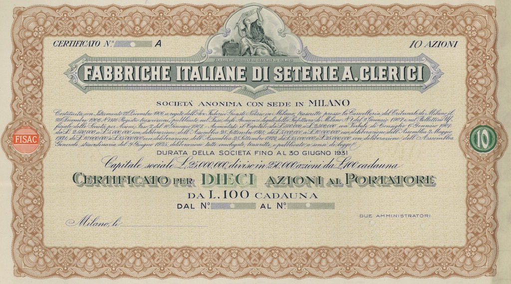 A-4756Fabbriche Italiane di Seterie A. Clerici-1Officina Carte Valori Turati Lombardi e C. - MilanoMilano190610 azioni da Lire 100R2 (1001-5000 pezzi)S1 (da 0 a 25 €)