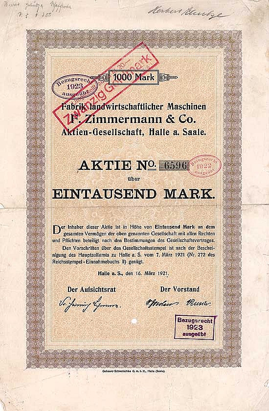 Fondata nel 1894 per rilevare e continuare la KG F. Zimmermann & Co. con filiali anche a Berlino, Breslavia, Norimberga e Schneidemühl. Lo stabilimento di Merseburger Str. 40, con circa 550 dipendenti, produceva macchine e attrezzature per l’agricoltura, oltre a una fonderia di ferro. Quotata alla Borsa di Halle a.S. e Lipsia. In liquidazione dal 1928, nel 1929 l’intera fabbrica di Halle e Ammendorf fu venduta alla fabbrica di automobili Otto Kühn.