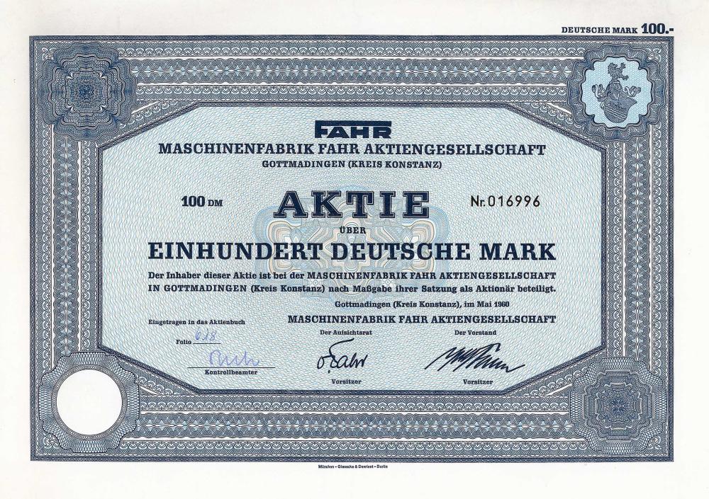 Fondata come officina meccanica nel 1870. Costruzione di una fonderia. AG dal 1911. Prodotti: falciatrici per erba, grano e rilegatura, voltafieno e ranghinatore, dal 1939 anche la produzione di un trattore da 22 CV. Produzione di mietitrebbie dal 1951/52, in seguito furono prodotte anche trince semoventi, spandiletame, falciatrici rotative, presse di plastica e carri di carico. Dopo aver rinunciato alla costruzione di macchine agricole nel 2001, la società cambiò nome in FAHR Beteiligungen AG (ora posseduta al 100% da KHD Humboldt Wedag AG) e trasferita a Colonia.