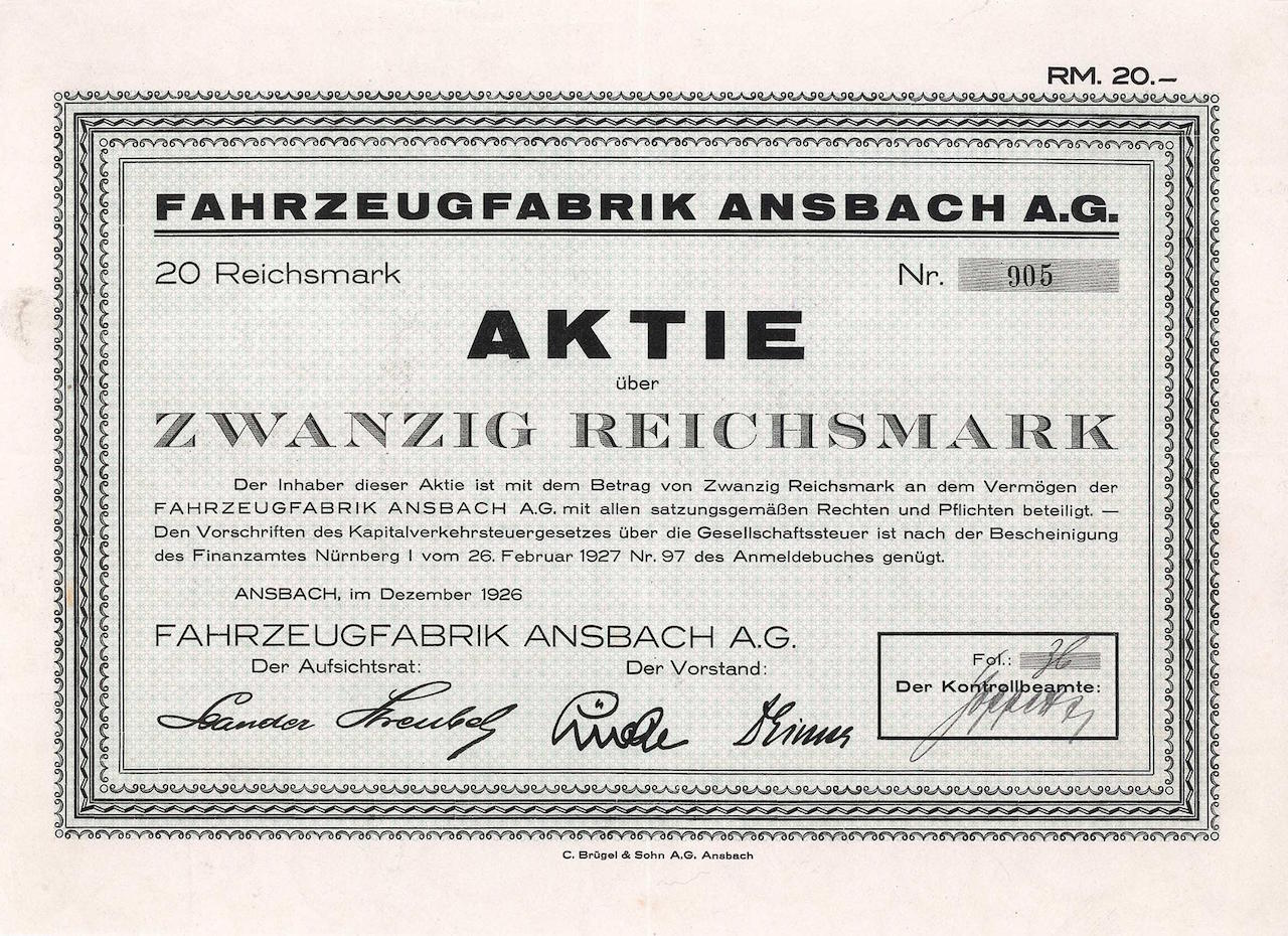 Fondata nel 1916 come fabbrica di veicoli Ansbach AG, dal 1917 al 1926 “Faun-Werke AG” (fabbriche di veicoli Ansbach e Norimberga AG). Fabbricazione di camion, autovetture, autobus e altri veicoli commerciali. Un’auto da turismo a 4 cilindri da 1559 cc con 14 CV, nota come Kautz, e i camion pesanti di Faun-Werke divennero particolarmente noti. Nel 1921 Fried. Krupp AG ha effettuato un investimento sostanziale attraverso un aumento di capitale. Nel 1926 fu confrontata la società, che tra l’altro raccogliere i fondi necessari per forzare la vendita dello stabilimento di Norimberga. Nel 1928 fece fallimento. La società successiva è ancora un importante produttore di veicoli comunali.