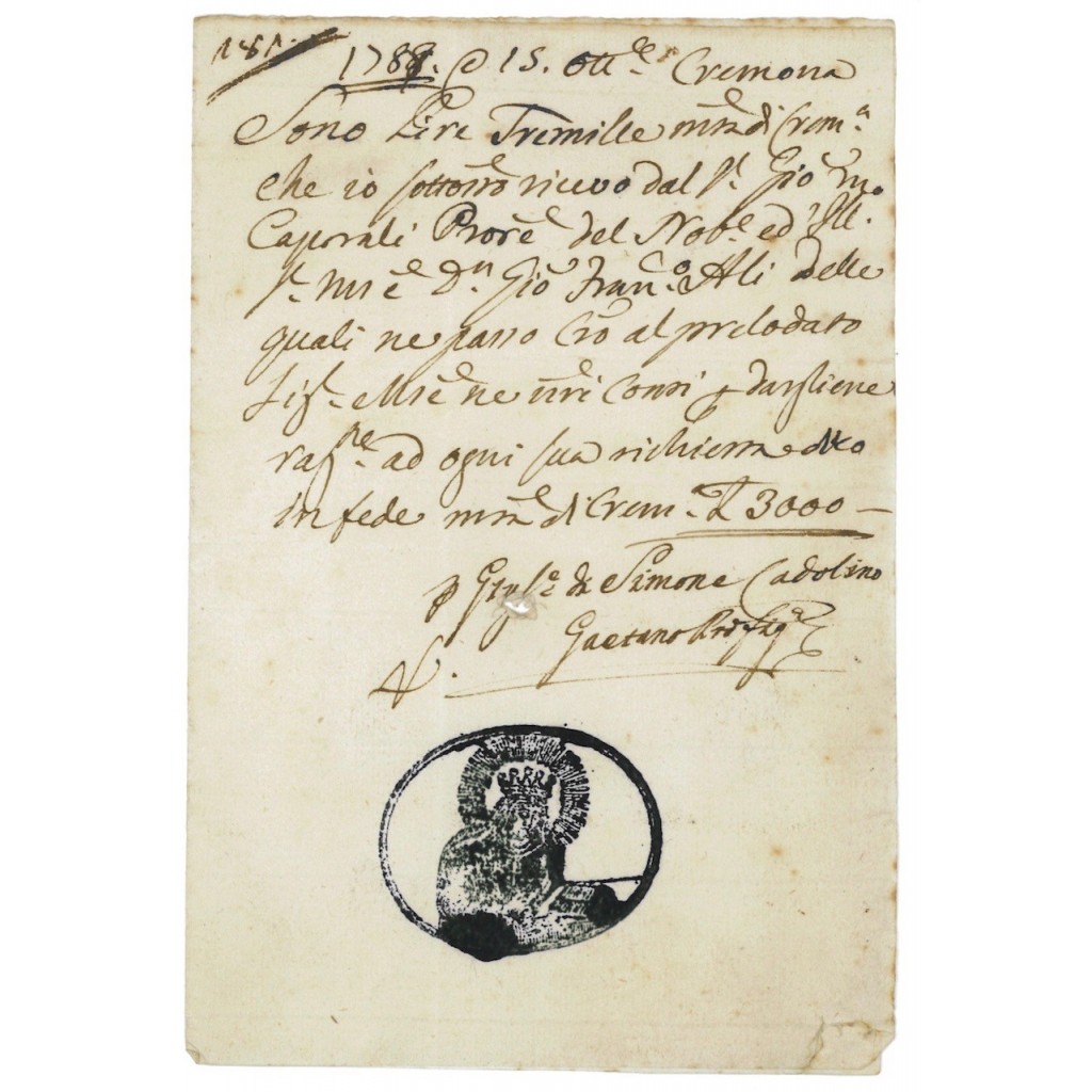 I-45708Fedi di credito cremonesi-9 Cremona 1788Fede di CreditoR4 (251-500 pezzi)S4 (da 101 a 250 €)