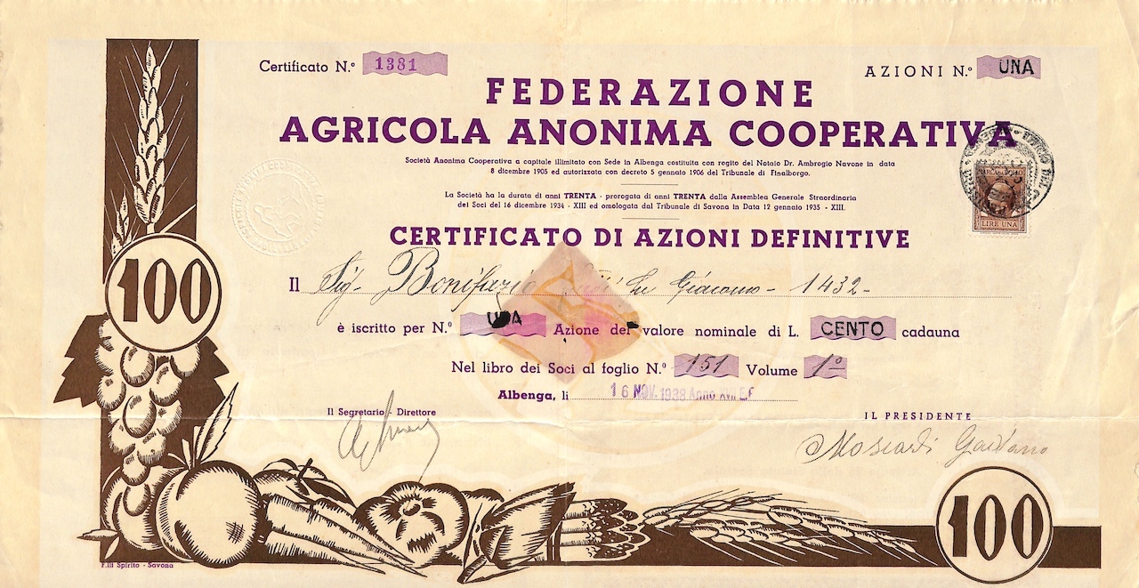 A-7241Federazione Agricola Anonima Cooperativa-1F.lli Spirito – SavonaSavona1938VariabileR2 (1001-5000 pezzi)S2 (da 26 a 50 €)