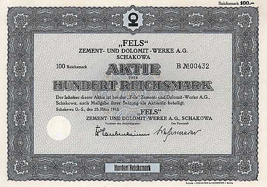 L’azienda risale alla Portland-Cement-Fabrik-AG “Szczakowa” fondata nel 1887 in Polonia. La fabbrica aveva una capacità produttiva annua di 390.000 t di cemento Portland, oltre a una distilleria di dolomite, che con una capacità annua di 100.000 t era una delle più grandi del continente. Le azioni sono state quotate a Vienna. Nel Terzo Reich, l’azienda passò sotto l’influenza del Reichswerke Hermann Göring (Stahlwerke Peine-Salzgitter). Dopo la guerra, Fels-Werke trasferì il quartier generale a Goslar / Harz, dove hanno ancora sede come importante produttore di materiali da costruzione (per inciso, la casa dei genitori dell’autore è diagonalmente di fronte alla sede principale in Ebertstraße). Da decenni appartenente al Gruppo Salzgitter, che nel 2001 ha ceduto le proprie quote ad Haniel.