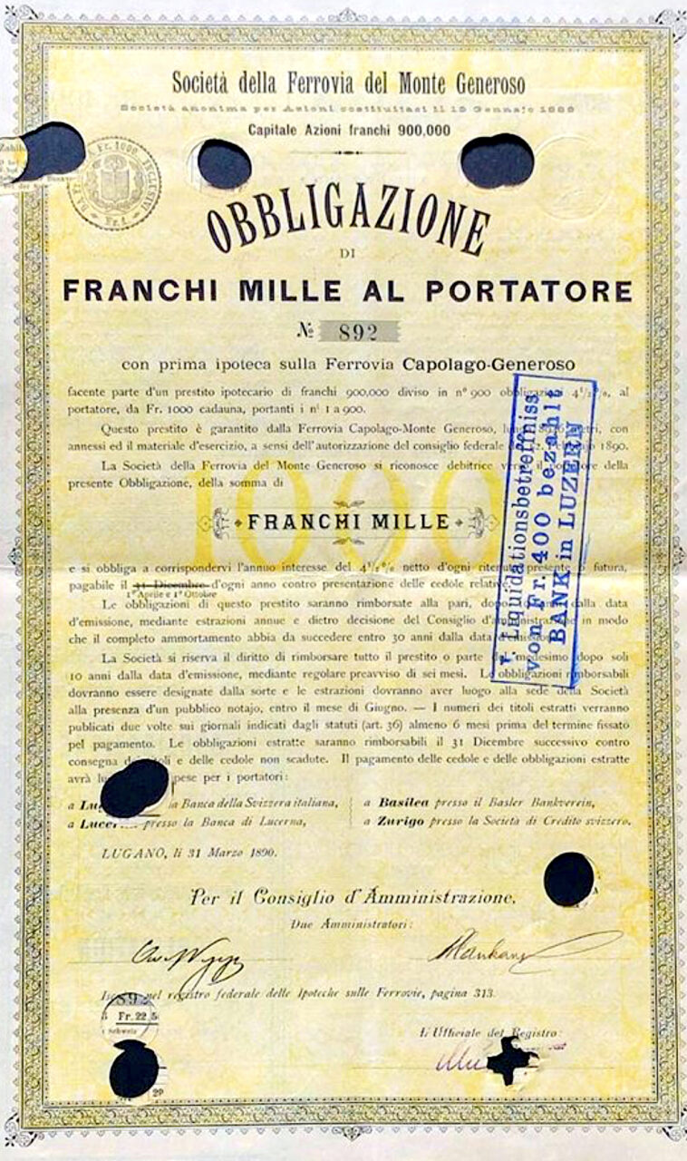 La ferrovia a scartamento ridotto e cremagliera Monte Generoso-Capolago venne dunque attivata il 5 giugno 1890; la frequentazione dei passeggeri si rivelò tuttavia molto inferiore alle attese, sicché già nel 1904 la società di gestione entrò il difficoltà economiche e venne posta in liquidazione. Pasta, che nel 1893 aveva ricapitalizzato di tasca propria l’impresa, era frattanto deceduto.