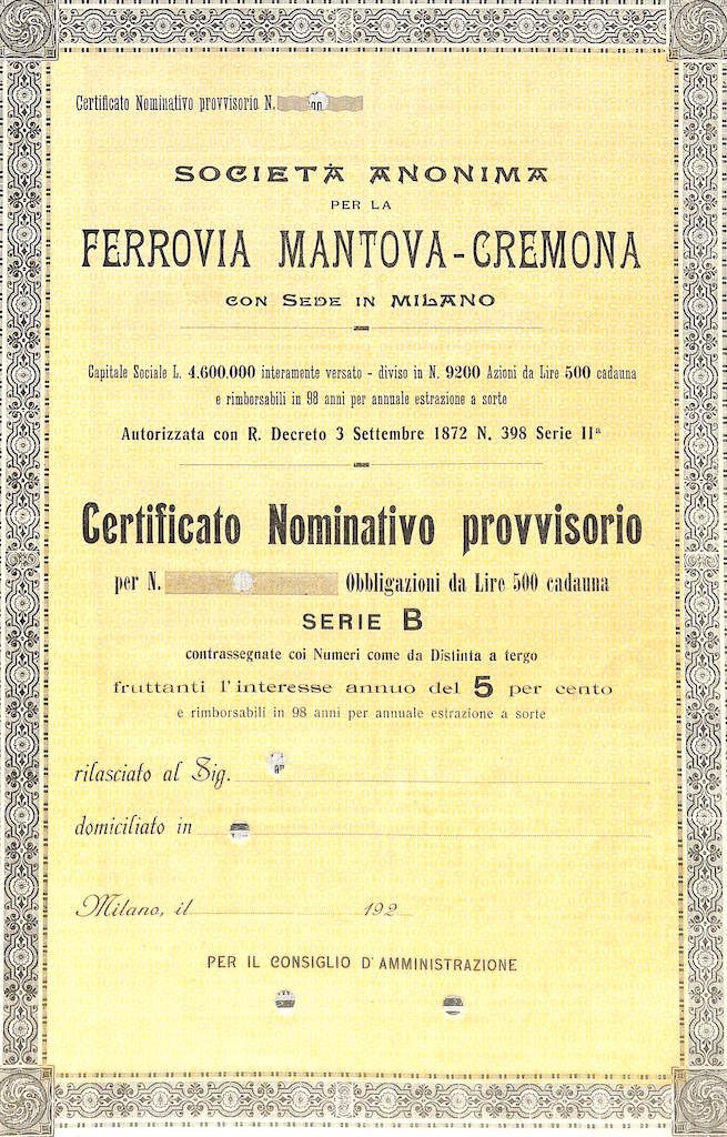 A-5671Ferrovia Mantova-Cremona S. A. per la-1Officina Carte Valori Coen & C. Milano - ParigiMilano1872VariabileR3 (501-1000 pezzi)S3 (da 51 a 100 €)