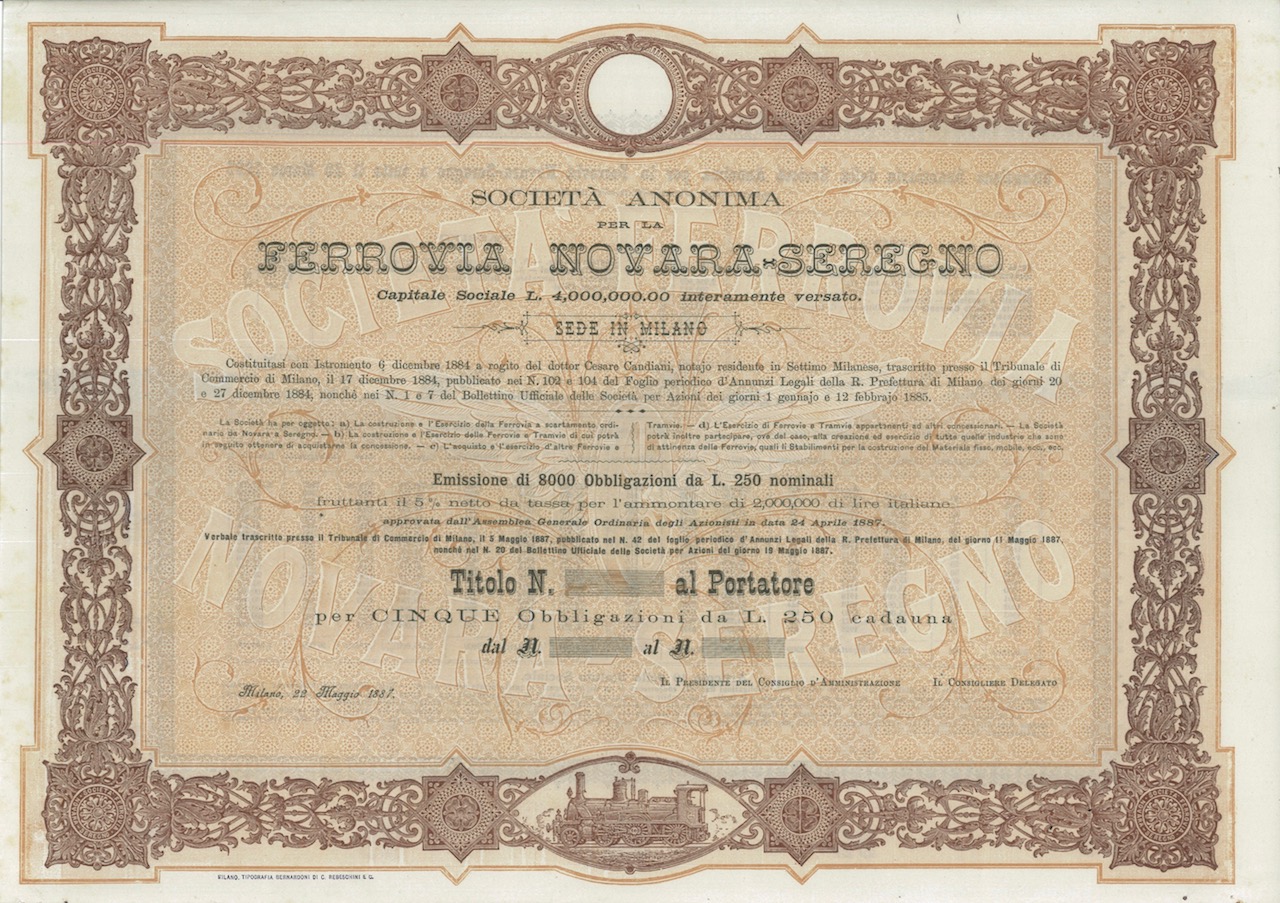 B-9985Ferrovia Novara-Seregno S. A. per la-2Tip. Bernardoni di C. Rebeschini & C.Milano18875 obbligazioniR6 (51-100 pezzi)S4 (da 101 a 250 €)