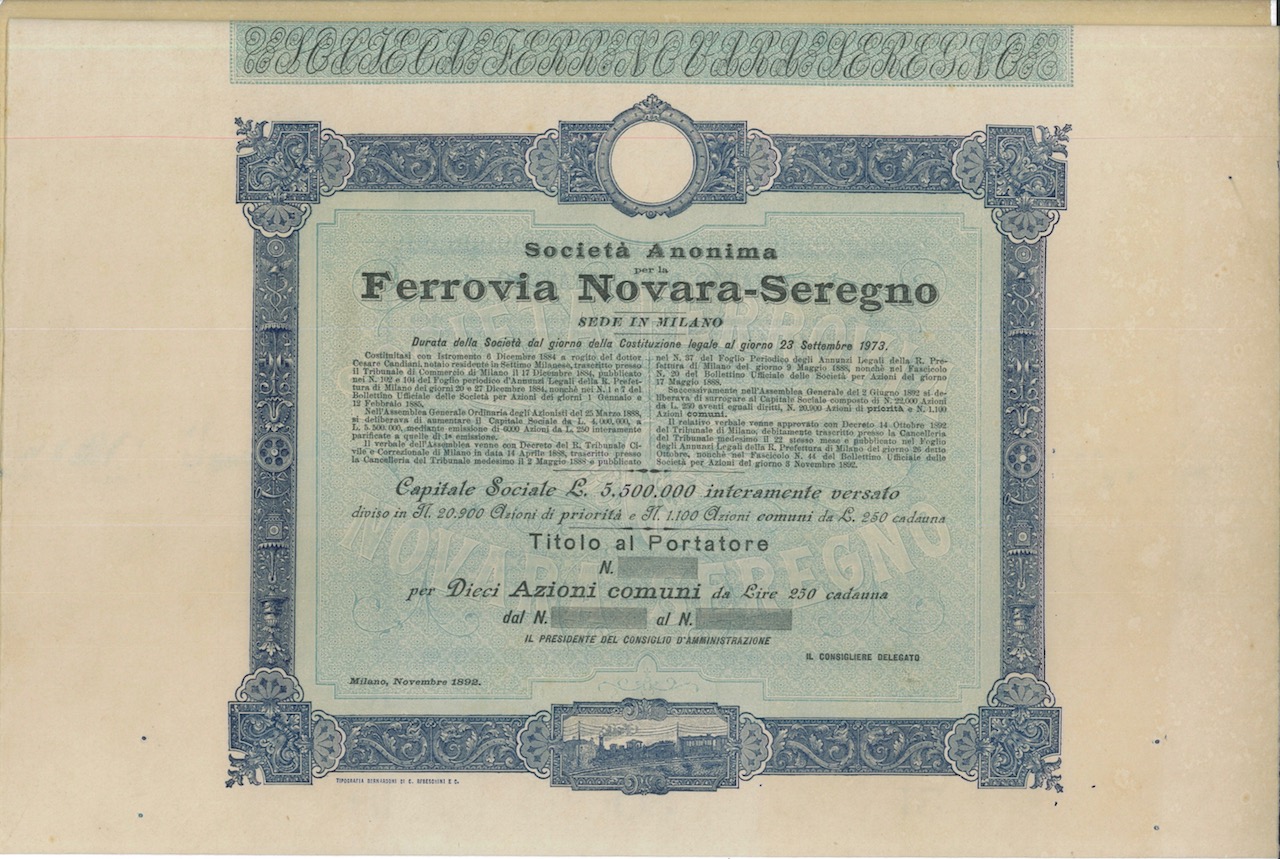 G-9985Ferrovia Novara-Seregno S. A. per la-7Tip. Bernardoni di C. Rebeschini & C.Milano189210 azioniR6 (51-100 pezzi)S5 (da 251 a 500 €)