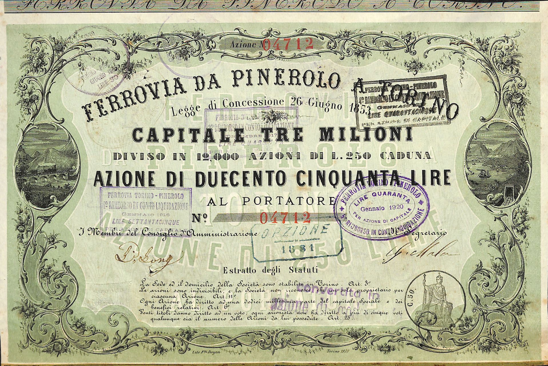 Il progetto per una ferrovia che unisse Pinerolo a Torino prese forma nella primavera del 1845 con la costituzione di una società promotrice per la sua costruzione. Nel 1849 questa veniva riconosciuta con Decreto Reale, che ne approvava lo statuto ed il regolamento.
