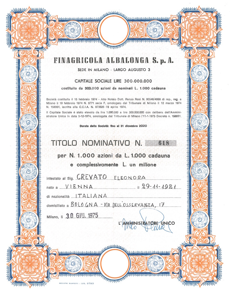 A-4838Finagricola Albalonga S.p.A.-1Registri BuffettiMilano19751000 azioniR2 (1001-5000 pezzi)S2 (da 26 a 50 €)