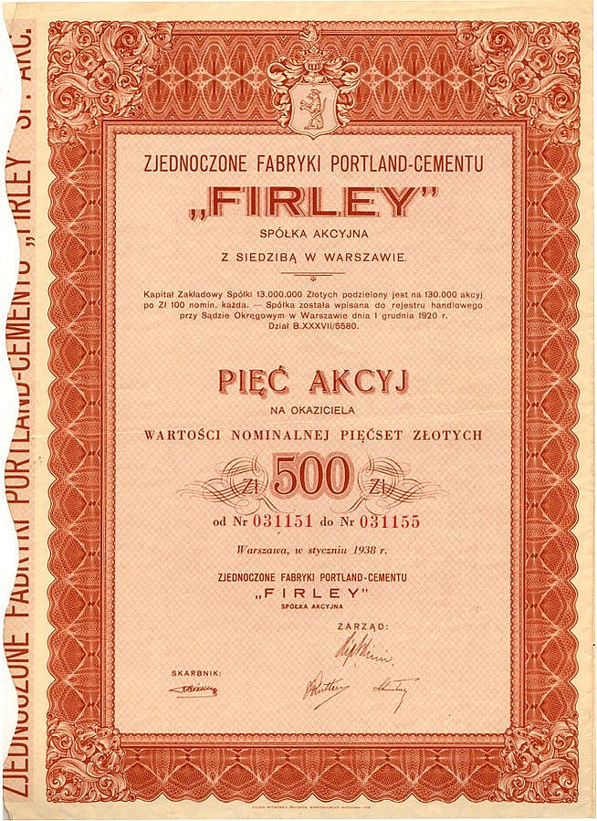 A-58020Firley Zjednoczone Fabryki Portland-Cementu-1Varsavia19385 azioni al portatore da 100 Zloty--