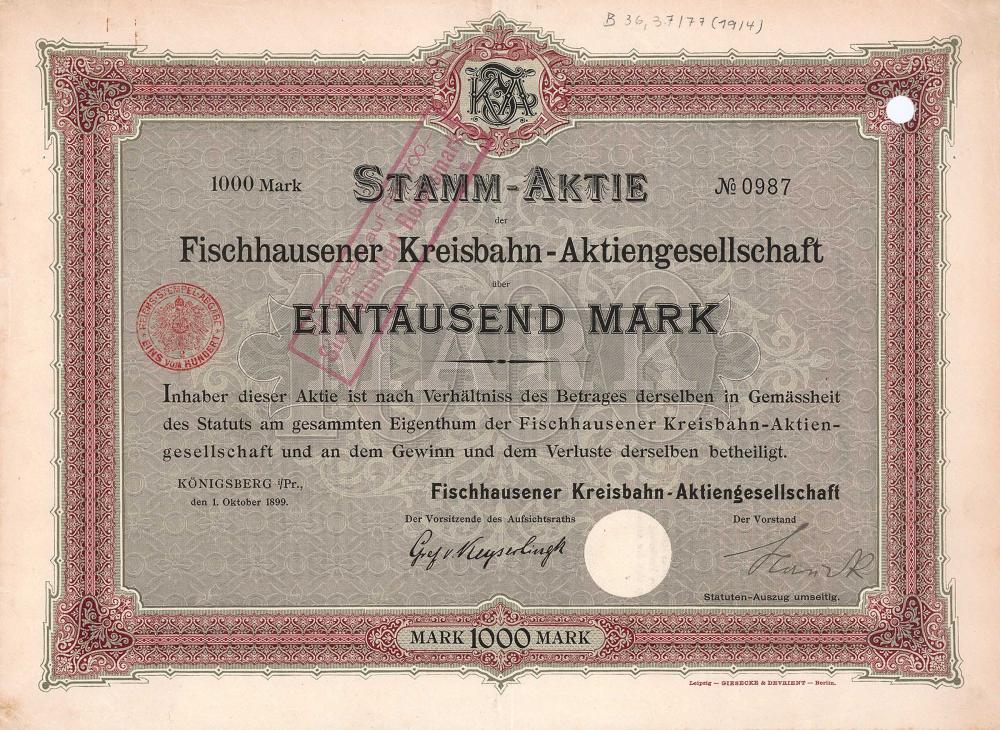 Fondata nel 1899 dallo stato della Prussia, dalla provincia della Prussia orientale, dal distretto di Fischhausen e dalla Lenz & Co. GmbH per la costruzione e l'esercizio della ferrovia a scartamento normale Marienhof-Gaffken di 18,6 km (circa 25 km a ovest della capitale di Könihsberg nella Prussia orientale). A Marienhof collegamento con la linea Königsberg-Neukuhren della Samlandbahn AG, con la quale è stata effettuata un'operazione congiunta dalla Ostdeutsche Eisenbahn-Gesellschaft appartenente alla AG für Verkehrswesen. Oltre Gaffken alla città distrettuale di Fischhausen, a 5 km di distanza, è stata utilizzata anche la tratta Palmnicken-Fischhausen costruita dalla ferrovia meridionale della Prussia orientale. Con l'invasione dell'Armata Rossa all'i... Altro