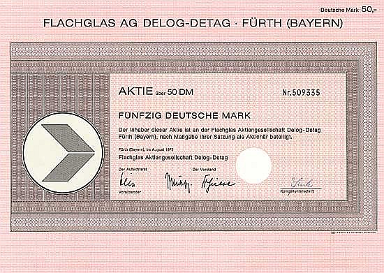 Fondata nel 1899 con l’acquisizione di Glasfabrik Weiden AG vorm. Ed. Kupfer, nello stesso anno il nome fu cambiato in “Tafel-, Salin- und Spiegelglasfabriken AG”, Fürth (Bay.), nel 1932 nome cambiato in Deutsche Tafelglas AG (Detag). Nel 1927 nello stabilimento di Weiden viene costruita una moderna linea di trafilatura “Fourcault” per il vetro delle finestre. Nek 1929/30 vendita della vetreria Mitterteich a Deutsche Spiegelglas AG, Grünenplan / Hann. Nel 1932 acquisizione della fabbrica di vetro Crengeldanz AG a Witten (Ruhr) da Gelsenkirchener Bergwerks-AG che, come il sindacato Kunzendorfer Werke (Niederlausitz), è stata fusa con Deutsche Tafelglas AG nel 1932. Nello stesso anno anche l’acquisizione di Vopelius’schen e Wentzel’schen Glashütten GmbH, Sulzbach (Saar). Nel 1949, ai tre stabilimenti di Fürth, Weiden e Witten, di proprietà della SIGLA GmbH, Wernberg (Opf.), fu aggiunta una fabbrica di vetri di sicurezza. A poco a poco, l’ex società mineraria Dahlbusch di Gelsenkirchen (oggi Dahlbusch Verwaltungs-AG) ha acquisito la maggioranza delle azioni, mentre la britannica Pilkington Brothers Ltd. ha acquisito Dahlbusch. la maggioranza. Nel 1970 acquisizione della tedesca Libbey-Owens-Gesellschaft für di produzione meccanica di vetro AG (DELOG) a Gelsenkirchen e cambio di nome in “Flachglas AG DELOG-DETAG”. Il gruppo Pilkington Flachglas era ora il più grande produttore di vetro al mondo con oltre 40.000 dipendenti. Nel 2000 cambio del nome in “Pilkington Deutschland AG” e trasferimento a Gelsenkirchen. Il procedimento arbitrale per il risarcimento dei pochi liberi soci rimasti si trascinava per quasi 20 anni. Nel 2006, Pilkington è stata poi rilevata da “Nippon Sheet Glass”.