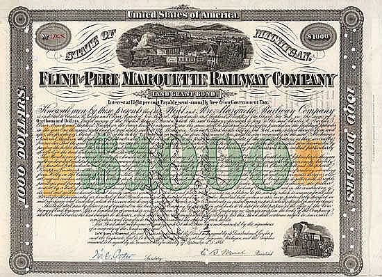 Fondata il 22 giugno 1857, riorganizzata nel 1872, operatività ferroviaria dal dicembre 1874. Nel 1879 la società divenne insolvente. Liquidazione del fallimento il 27 giugno 1880. Il 18 agosto 1880, la compagnia fu venduta all'Associazione degli obbligazionisti, che ristabilì il 31 agosto 1880 il nome come Flint & Pere Marquette Railroad (precedentemente Railway). La rete di rotte era degli ultimi 650 miglia con la linea principale Monroe-Ludington, Mich.