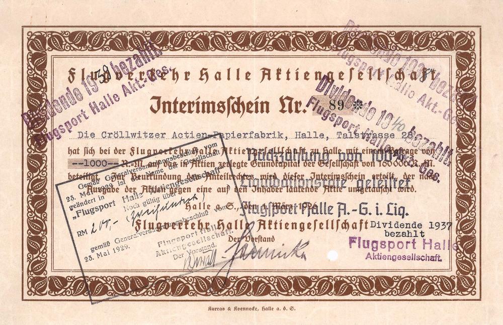 Fondata nel 1925 da parti interessate private e istituzionali della regione con un capitale di 160.000 RM per la costruzione di strutture aeroportuali a Halle e dintorni, acquisto e vendita di aeroplani, gestione di rotte aeree e trasporto di persone e merci per via aerea, noleggio di aerei e aeromobili. Nel 1929 ribattezzata Flugsport Halle AG e trasformata in una società senza scopo di lucro, che doveva servire il funzionamento dell’aeroporto di Halle-Nietleben nonché la promozione dell’aviazione e degli esercizi fisici. Dopo la seconda guerra mondiale lo sviluppo aeronautico continuò dal 1952 al 1968.