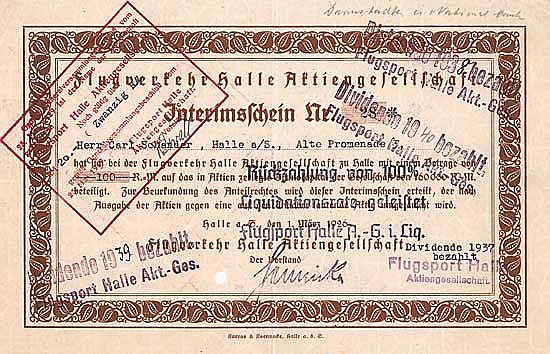 Fondata nel 1925 da parti interessate private e istituzionali della regione con un capitale di 160.000 RM per la costruzione di strutture aeroportuali a Halle e dintorni, acquisto e vendita di aeroplani, gestione di rotte aeree e trasporto di persone e merci per via aerea, noleggio di aerei e aeromobili. Nel 1929 ribattezzata Flugsport Halle AG e trasformata in una società senza scopo di lucro, che doveva servire il funzionamento dell’aeroporto di Halle-Nietleben nonché la promozione dell’aviazione e degli esercizi fisici. Dopo la seconda guerra mondiale lo sviluppo aeronautico continuò dal 1952 al 1968.