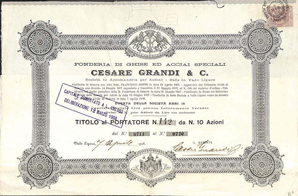 A-904Fonderia di Ghise ed Acciai Speciali Cesare Grandi & C.-1Savona190810 azioni da Lire 100R3 (501-1000 pezzi)S4 (da 101 a 250 €)