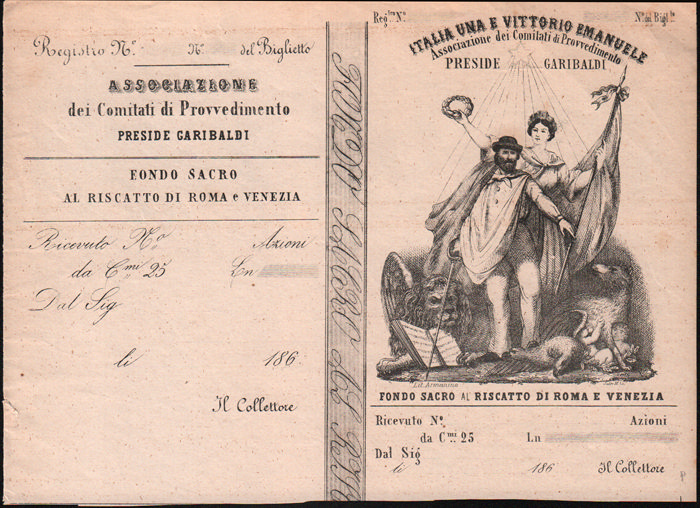 I buoni di sottoscrizione per la Campagna mirante al riscatto di Roma e Venezia, che doveva terminare nello scontro fratricida di Aspromonte del 29 Agosto 1862, furono preparati l’anno prima e se ne conoscono tre tipi differenti. Il primo è il più comune dei tre e ha un valore di cent. 25, stampato in carta bianca con una bella immagine simbolica che raffigura Garibaldi in piedi incoronato dall’Italia, e in basso ai due lati i simboli di Roma e Venezia (la Lupa e il Leone). In alto la scritta in tre righe: “Italia una e Vittorio Emanuele / Associazione dei Comitati di Provvedimento / Preside Garibaldi” e una stella raggiante. In basso: ” Fondo sacro al riscatto di Roma e Venezia”. Questo artistico disegno è stampato in litografia dalla Ditta Armanino di Genova (mm. 156 x mm 215 – foto n° 6). Il secondo buono, realizzato su cartoncino bianco, molto più raro del precedente, ha il valore di 1 franco. Vi è riprodotto in nero una immagine geografica dell’Italia nella quale spiccano, completamente in nero, il Lazio e il Veneto. In alto la scritta: “Stella di Garibaldi”; sotto: “Unità – Libertà (mm. 90 H mm. 129 – foto n° 7)