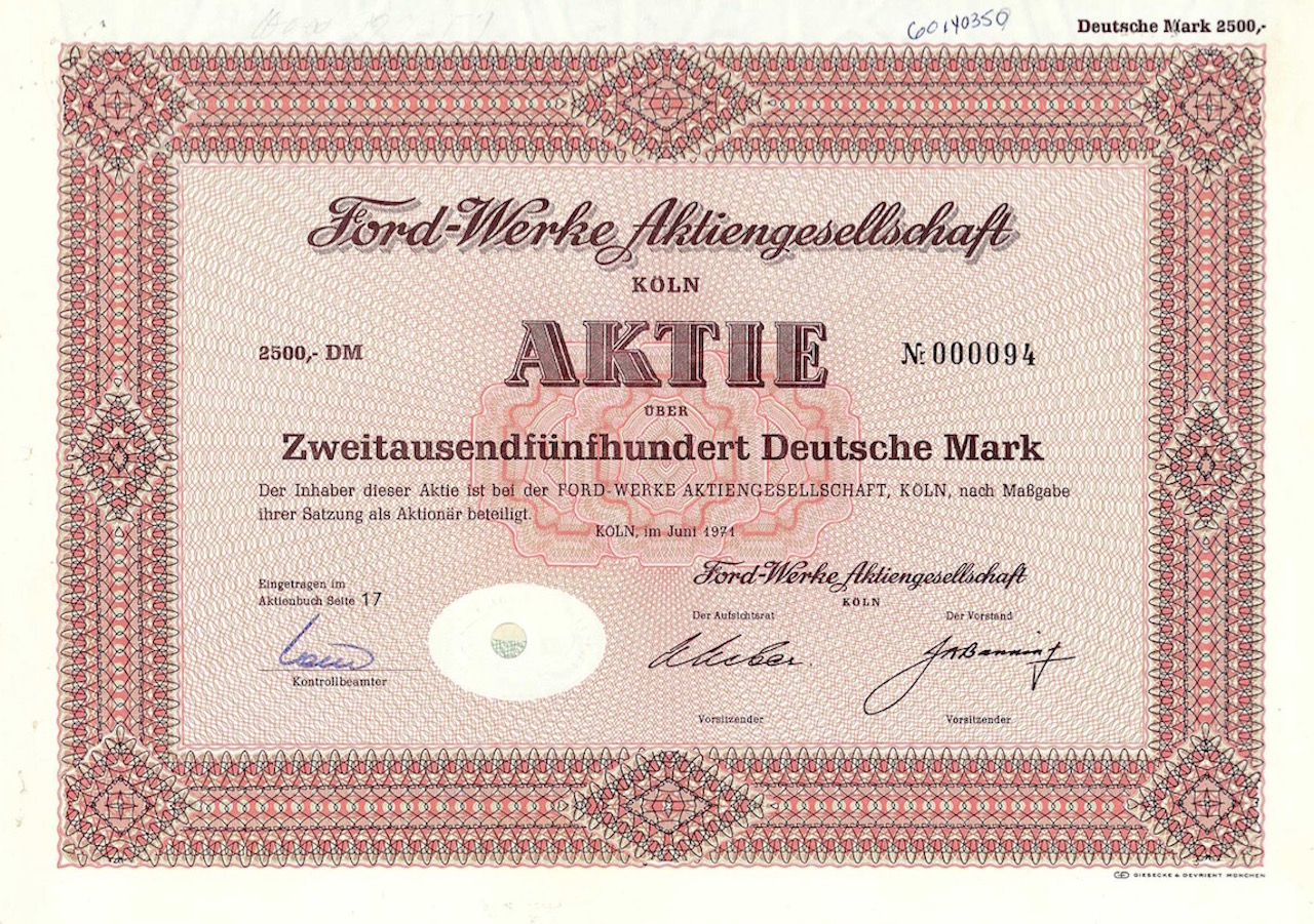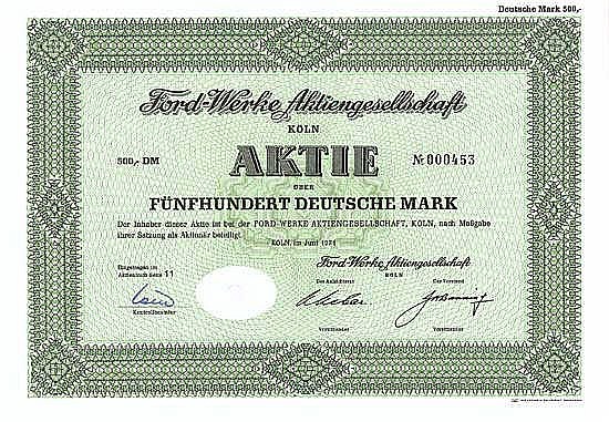 Henry Ford costruì la sua prima automobile nel 1896. Nel 1903 fondò la Ford Motor Company a Detroit. Negli anni ’20, la Ford deteneva una quota di mercato del 50% negli Stati Uniti e si espandeva rapidamente all’estero: nel 1925 fu fondata a Berlino la Ford Motor Company AG. Lo stabilimento di Berlino-Plötzensee era inizialmente un impianto di assemblaggio puro. Nel 1931 entrò in funzione lo stabilimento di Colonia, che esiste ancora oggi, la pietra angolare che Henry Ford posò personalmente. Nel 1939 fu adottato l’attuale nome dell’azienda: Ford-Werke AG. Naturalmente non subirono gravi danni di guerra gli impianti Ford, in modo che la produzione potesse riprendere l’8 maggio 1945. Già nel 1953, grazie al leggendario Taunus 12 M, furono azzerati tutti i precedenti record di produzione. Quotata anche in borsa in Germania fino alla compressione nel 2002.