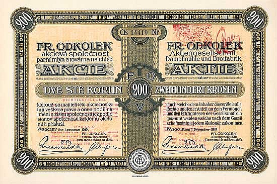 A-69145Fr. Odkolek AG Dampfmühle und Brotfabrik-1Wysocan19191 azione da 200 Corone--