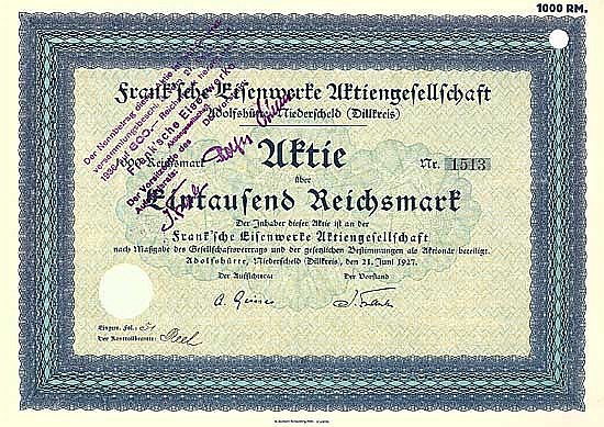 Il nucleo dell’azienda è la Hammerwerk Adolfshütte, fondata nel 1607 dal conte Georg von Nassau-Catzenelnbogen e successivamente ducale di Nassau. Nel 1839, Adolf Herzog von Nassau vende il Ducato di Nassau Hammer vicino a Niederscheld per 6.000 fiorini ai pastori Christian e Georg Frank e all’ispettore minerario Giebeler. Nel 1927 trasformazione in AG in occasione della fusione con Franksche Eisenwerke GmbH a Nievernerhütte presso Bad Ems (Nievernerhütte fondata nel 1671, dal 1861 AG come “Nieverner Bergwerks- und Hüttenverein”, dal 1903 GmbH, dal 1916 Comunità di interessi con Adolfshütte). La proprietà mineraria sfruttata nel Dillrevier e sul Lahn fu venduta nel 1927 dopo che la produzione di ghisa era stata abbandonata intorno al 1885. La Nievernerhütte fu chiusa nel 1937. L’ultimo in funzione fu l’Adolfshütte (l’85% del quale fu distrutto nel bombardamento della stazione ferroviaria di Dillenburg all’inizio del 1945) e il Reddighauser Hammer vicino a Battenberg. Produzione di stufe e stufe per ambienti in ghisa “Oranier”, stufe per bollitore “Frank” e vomeri “Frank”, nonché macchine tessili del programma dell’ex fabbrica di macchine Niederlahnsteiner. Dal 1974 anche produzione di sistemi di compattazione rifiuti. Nel 1985 cambio di nome in FRANK AG, fatturato annuo di oltre 100 milioni di DM. Nel 1994 fallisce dopo 387 anni di storia dell’azienda.